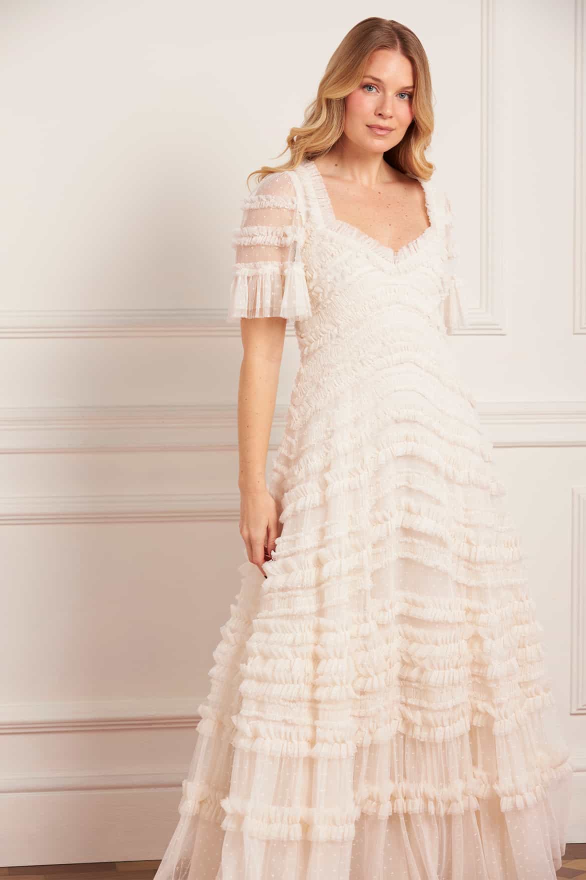 NEW SEASON. The Amara Ruffle Gown in Cream. Crafted from layers of soft tulle, beautifully engineered with cascading ruffles that create graceful movement. Featuring frothy fluted sleeves and a sweeping hemline, this romantic gown captures the spirit of ethereal femininity.