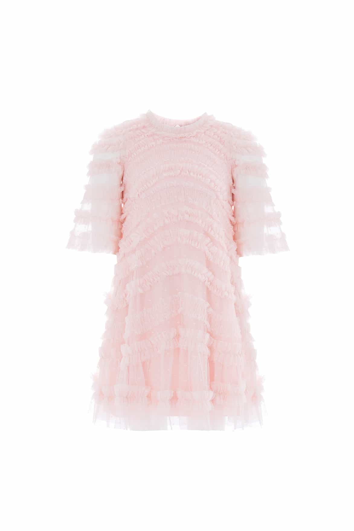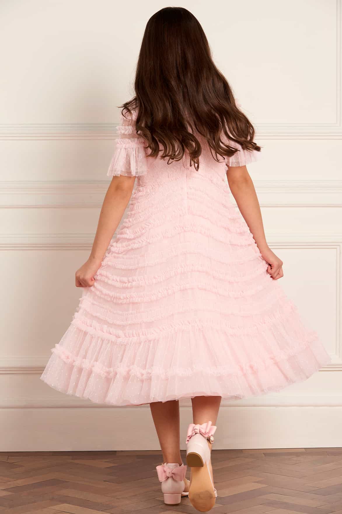 NEW SEASON. The Amara Ruffle Kids Dress in Seashell. Features gentle ruffle tiers that float beautifully with movement. Made from lightweight tulle, this enchanting style captures the magic of childhood celebrations.