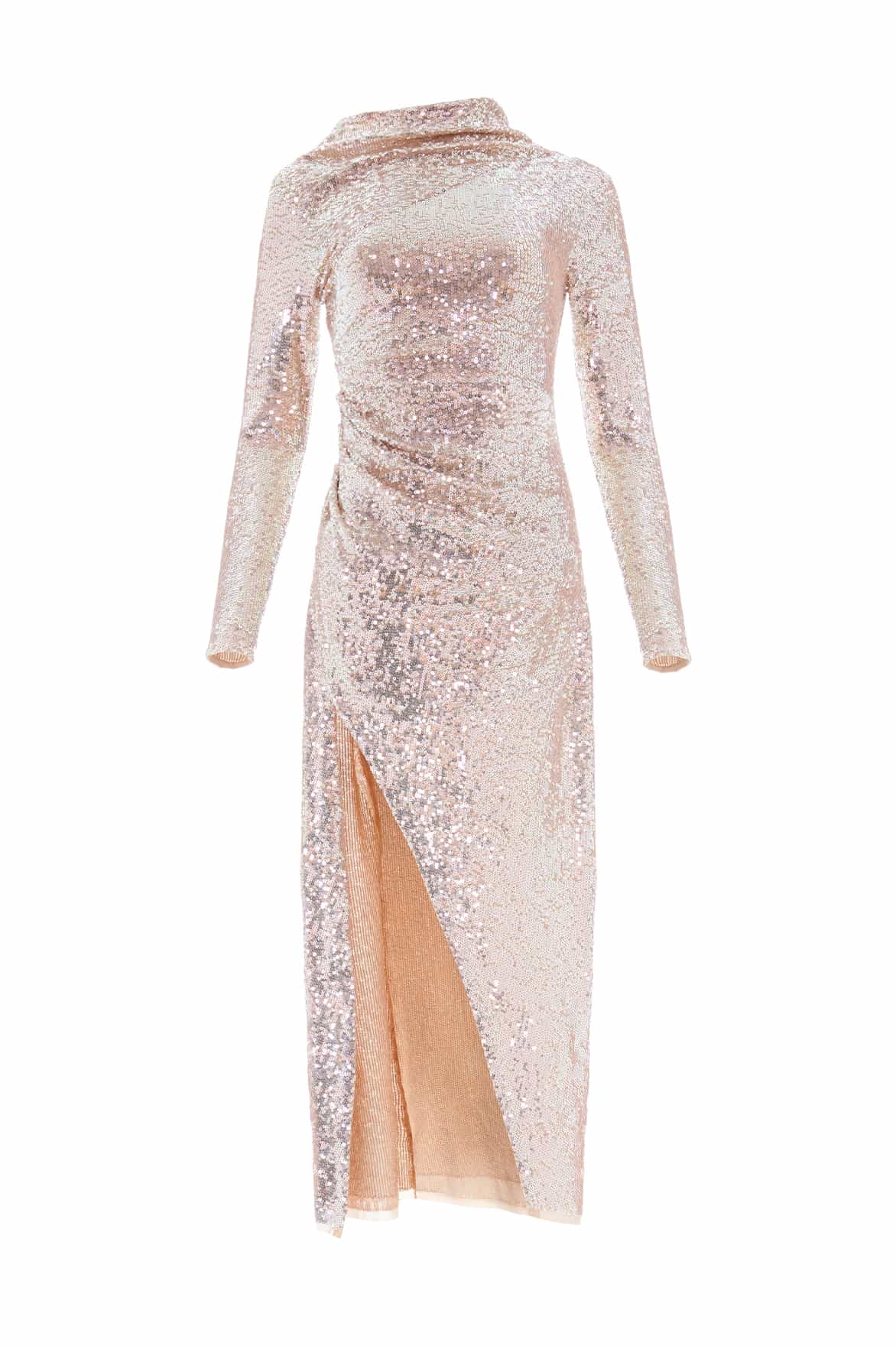 The Claudette Gloss Ankle Gown in Beige / Gold. This high shine gown is beautifully adorned with shimmering gloss sequins. Designed in a soft, stretch power mesh for ultra-comfort and fit. Crafted with a flattering and confident silhouette for a striking look. The perfect dress for a special event.