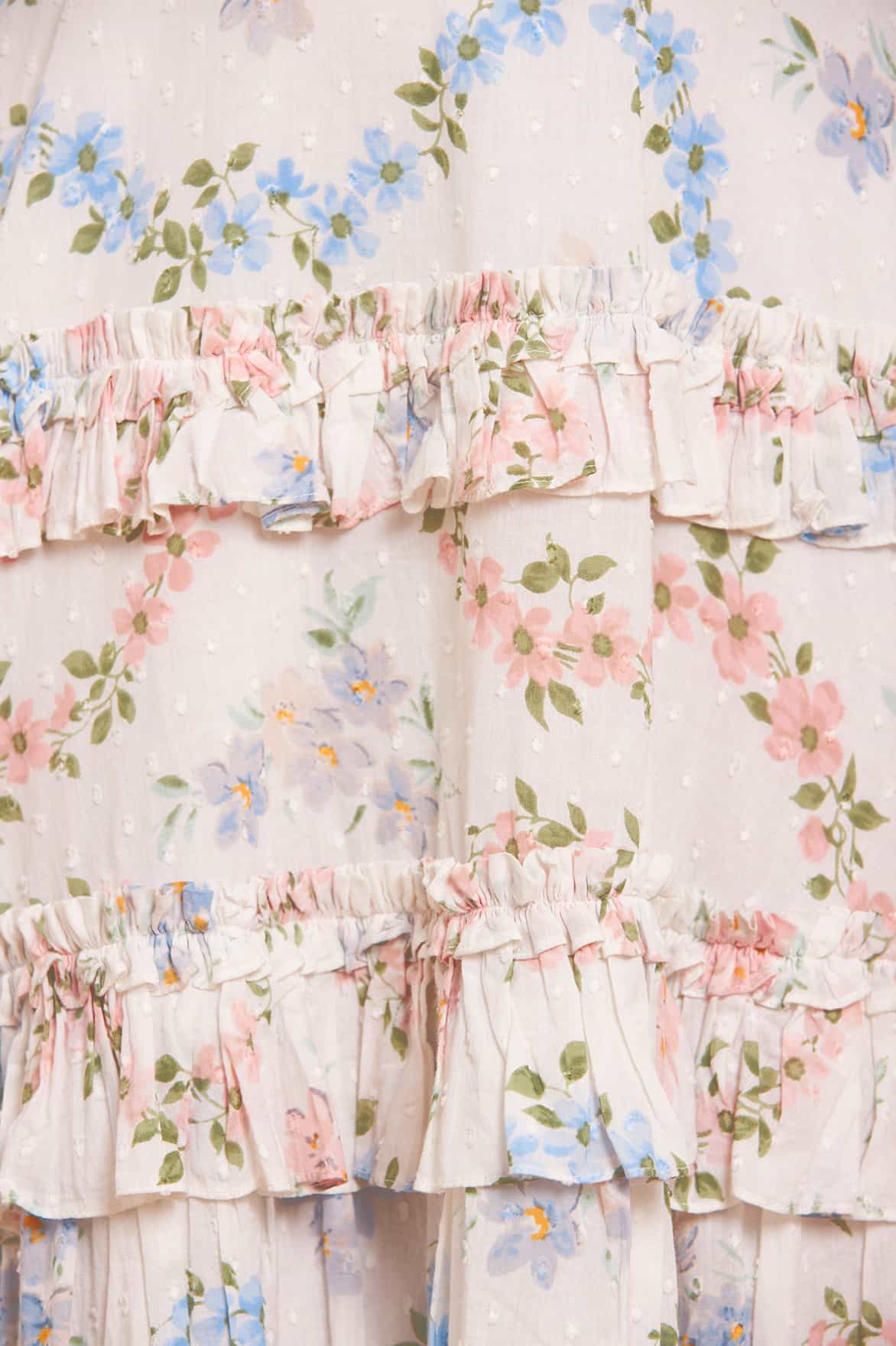 -Organic textured cotton decorated with floral print and cotton ruffles