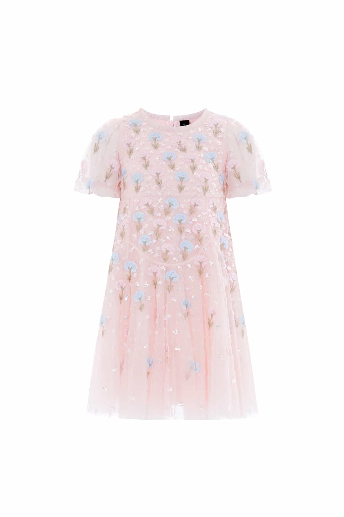 NEW SEASON. The Dandelion Ditsy Kids Dress in Seashell. Sparkles softly with intricate floral embroidery. Designed with a light tulle skirt and delicate ruffles, it’s made for magical, carefree moments. This piece matches the Dandelion Ditsy Ankle Gown from the womenswear line for a timeless coordinated style.