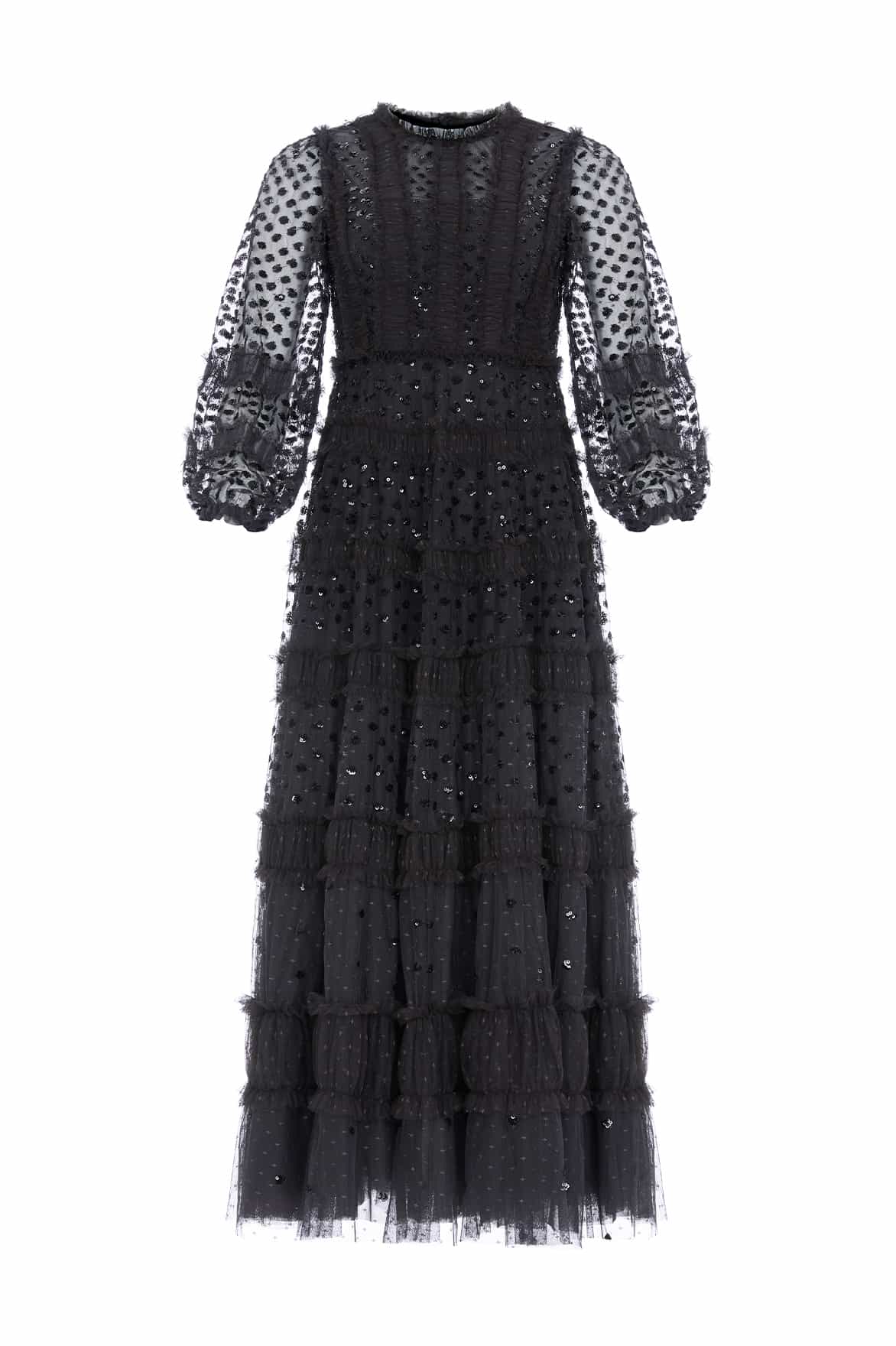 The Dot Shimmer Ankle Gown in Graphite. Beautifully decorated with gloss sequins creating an extra special shimmering finish. Romantically adorned with stitched ruffles creating texture and movement. Make this piece your new wardrobe favourite.