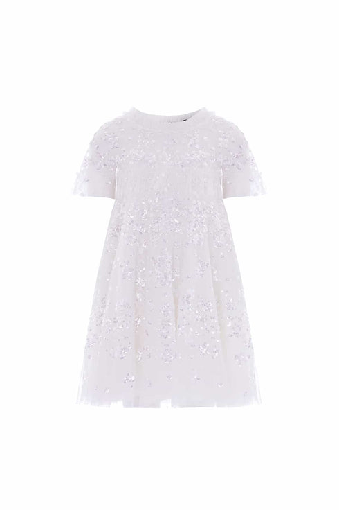 NEW SEASON. The Freya Cape Kids Dress in Swan White. This elegant kids dress showcases intricate Freya embellishment inspired by antique lacework. The flowing cape detail and softly layered skirt create a graceful silhouette with gentle sparkle. A beautiful occasion piece, designed to complement the Freya Cape Ankle Gown.