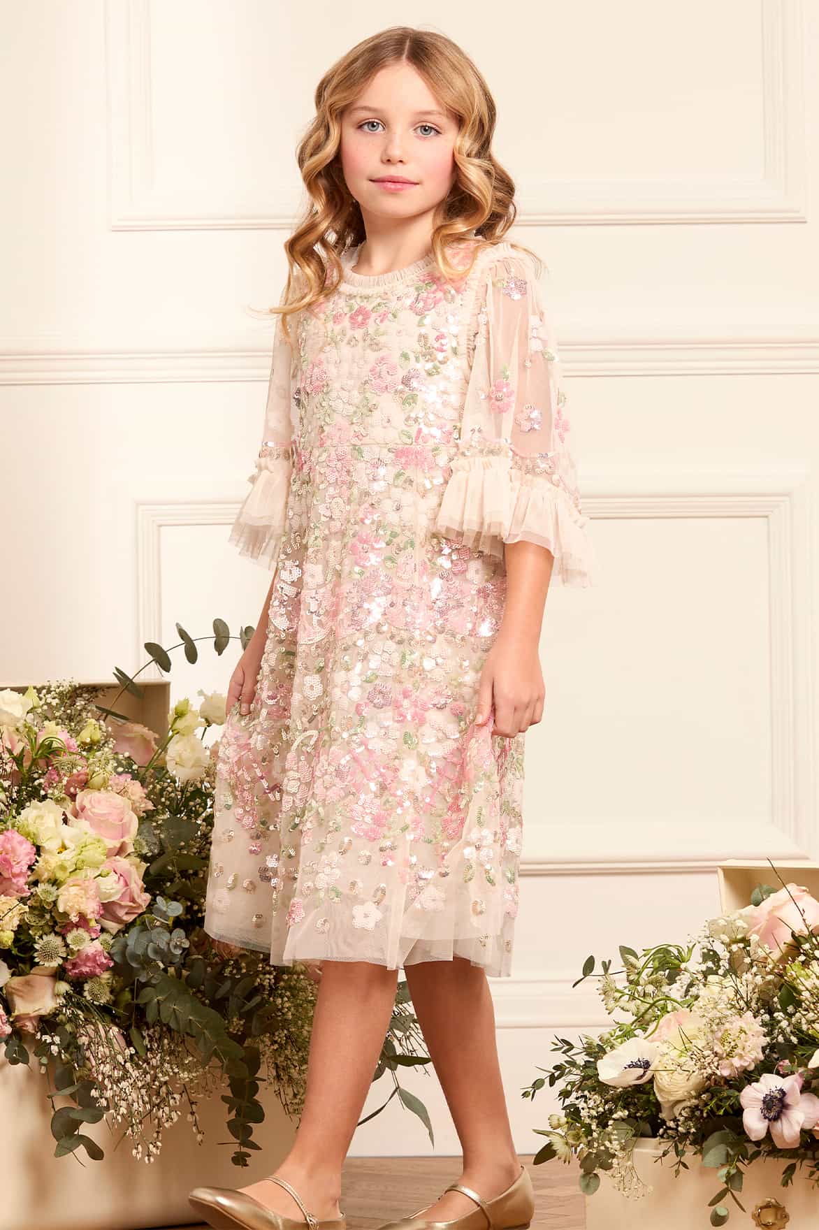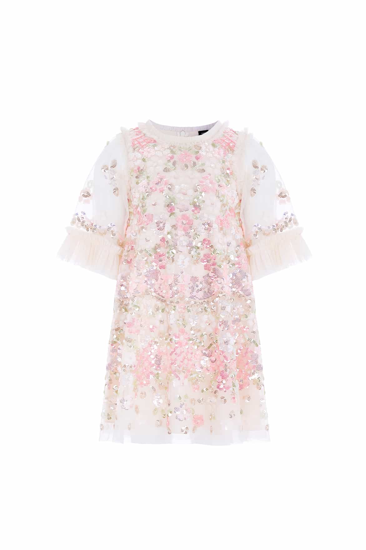 The Garden Delight Kids Dress in Cream. This dress features intricate lace-inspired artwork with floral and bold lace border details. Enhanced with foil-coated sequins for a high-shine effect, it has a loose-fit silhouette for comfort and easy styling. Designed with fluted sleeves with gathered tulle ruffles and signature Needle & Thread tulle frills at the neckline and shoulders. This enchanting dress is perfect for special occasions.
