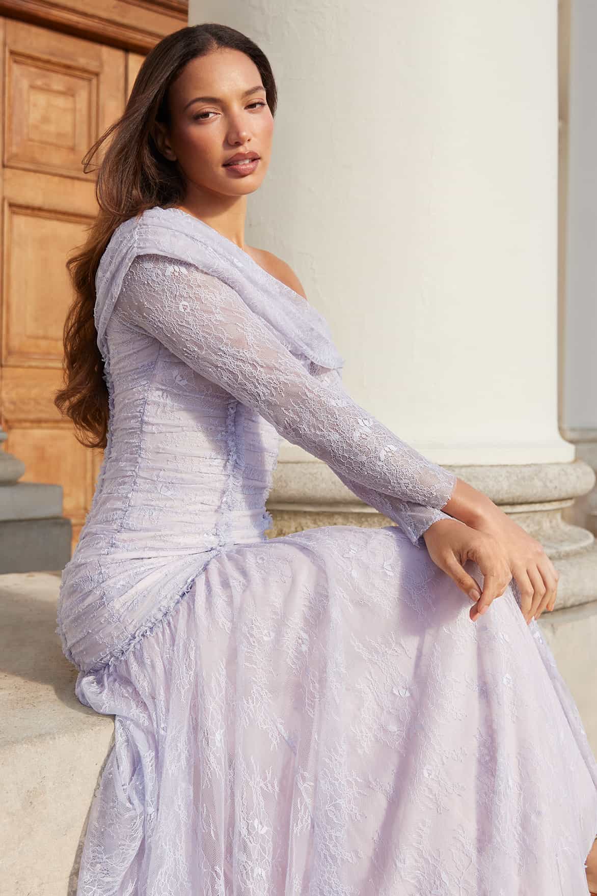 NEW SEASON. The Gigi Lace One-Shoulder Rouched Gown in Skylight/Seashell. A romantic statement crafted from delicate lace. Designed with a ruched bodice and one-shoulder silhouette, this gown combines soft texture and modern elegance in a refined pastel palette.