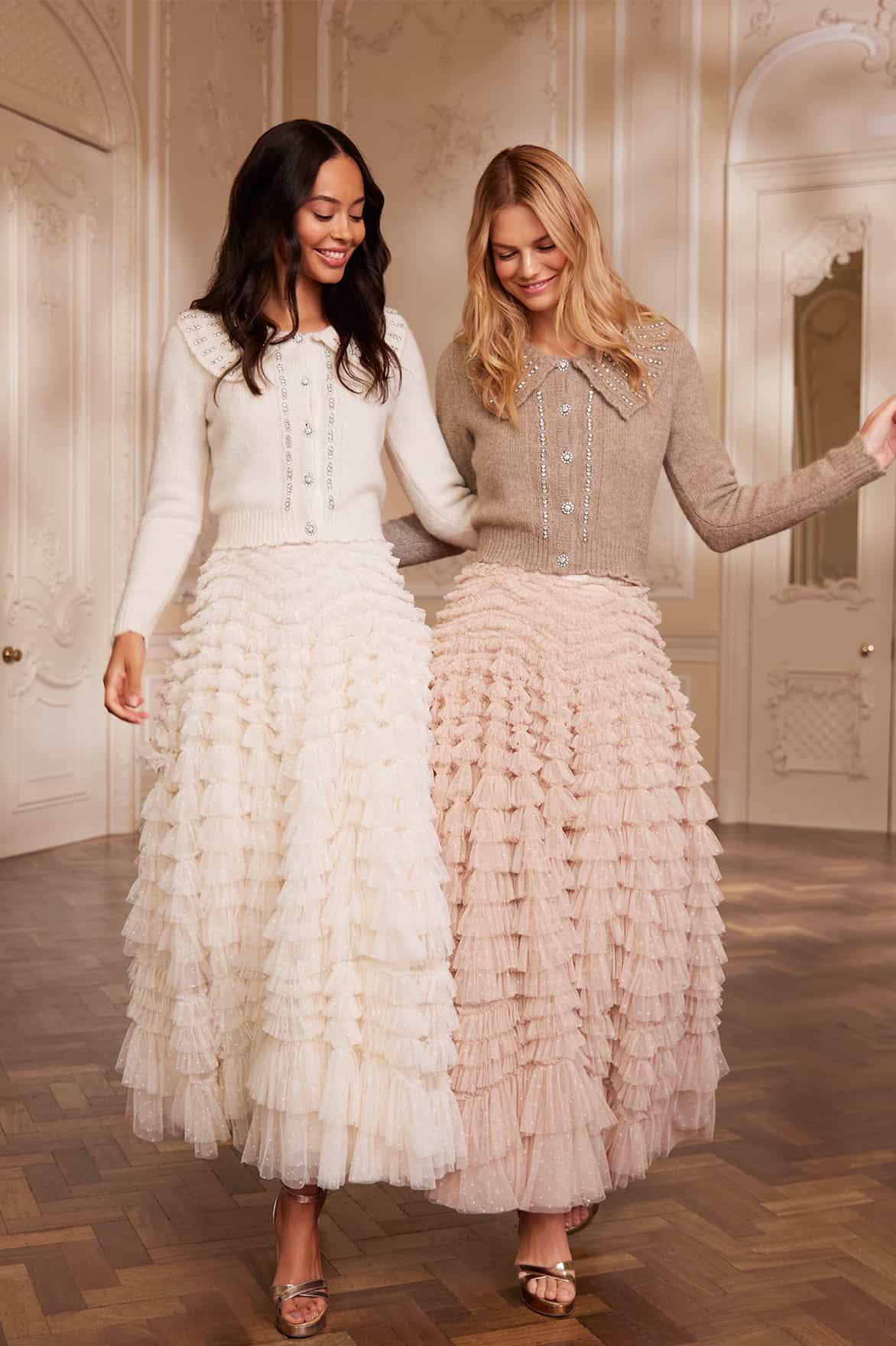 The Hattie Ruffle Skirt in Cream. This textile skirt is engineered with layers of soft tulle and net to create a signature Needle & Thread style. Crafted with individual ruffles to create a beautiful, frilly texture. Designed with a sweeping hemline and finished at the waist with a satin ribbon for extra detail. We recommend pairing this skirt with our knitwear for a romantic Needle & Thread look.