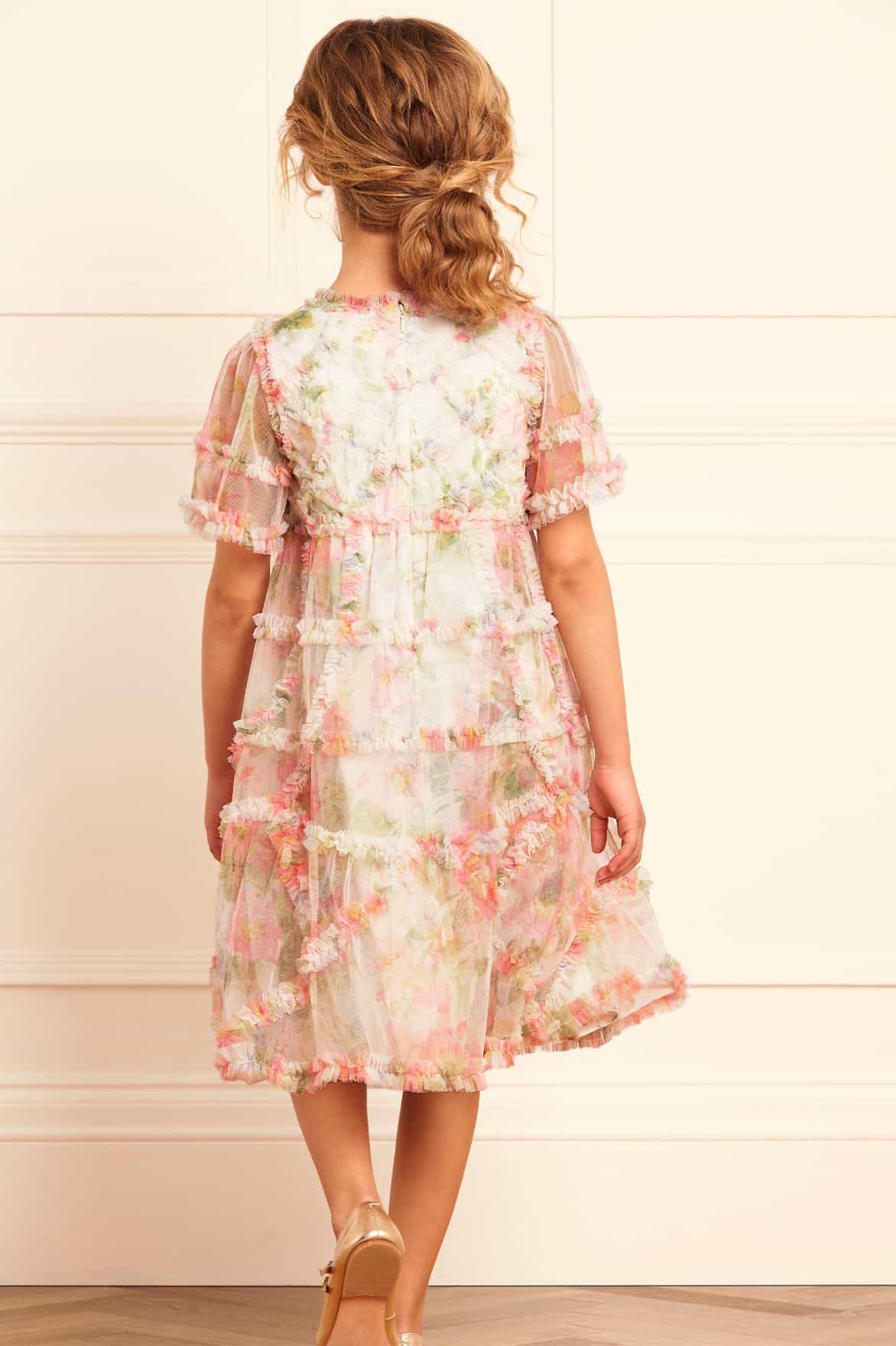 NEW SEASON. The Immortal Rose Maeve KIDS Dress in Moonshine. This dress is designed with a beautiful print, inspired from an antique early 1900's hand-painted artwork. Designed with the prettiest wild rose motifs in soft pastel pink, intertwined with vibrant green foliage. Developed with signature Needle & Thread textile tulle and delicate, gathered frills perfectly placed to add frothy texture throughout. The perfect wardrobe staple for your little one.