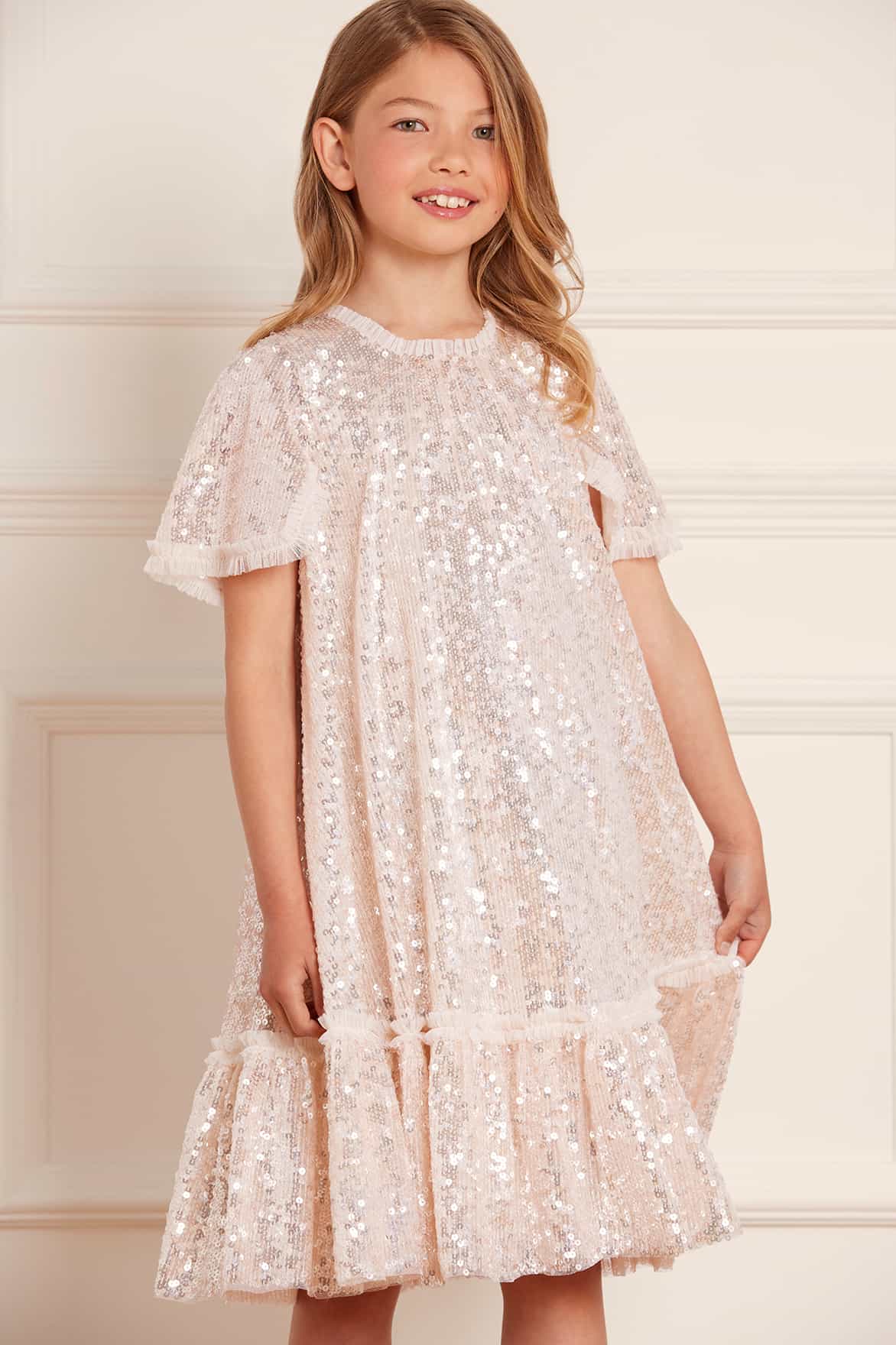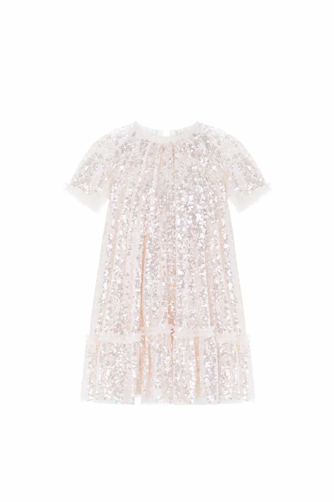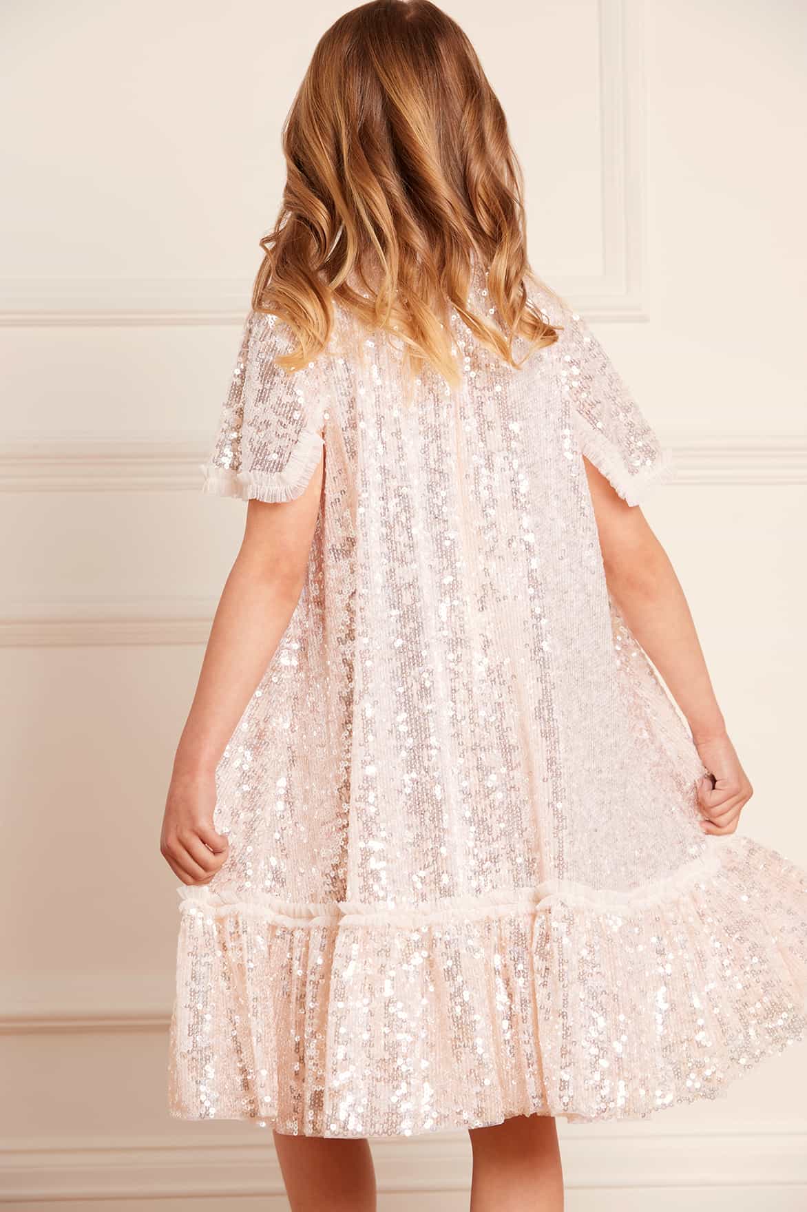 NEW SEASON. The Mila Gloss KIDS Dress in Cream. This statement dress is beautifully embellished with lustrous sequins, creating an all-over shimmering effect. Developed with an easy-to-wear yet playful trapeze silhouette and a voluminous skirt. Let your little one shine at their next event in the Mila Gloss.