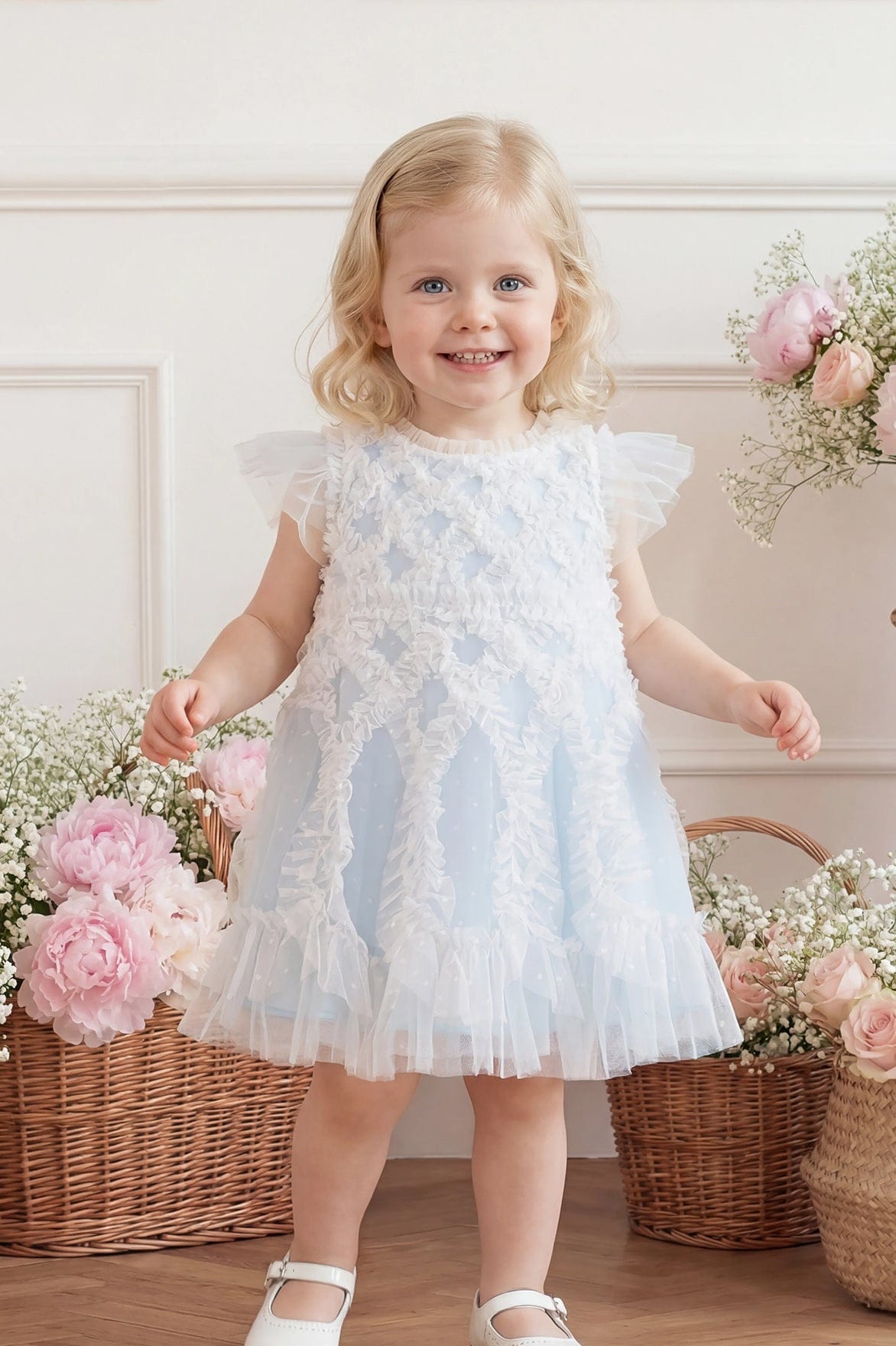 The Rosella Baby Dress in Dusk Blue/Cream. This dress features intricate cross-hatch frill detailing on the bodice, cascading into playful scalloped edges at the hem. Designed with contrast-colour frills and signature Needle & Thread touches at the neckline, waist, and shoulders adds whimsical charm. Finished with soft, layered tulle sleeves and fully lined in gentle cotton voile for all-day comfort. Complete with coordinating cotton dobby bloomers, edged in delicate frills. A timeless statement piece your little one will cherish forever.