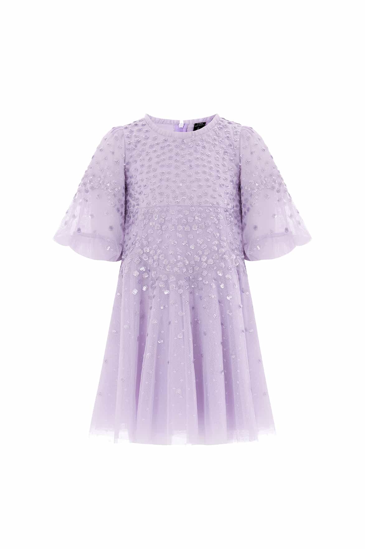 NEW SEASON. The Scallop Sequin Kids Dress in Lavender. Clusters of tiny sequins glisten forming delicate scalloped waves. Its pastel tone and flowing silhouette make it a perfect choice for joyful celebrations. This piece pairs perfectly with the Scallop Sequin V-Neck Ankle Gown from the womenswear line for a matching special-occasion look.