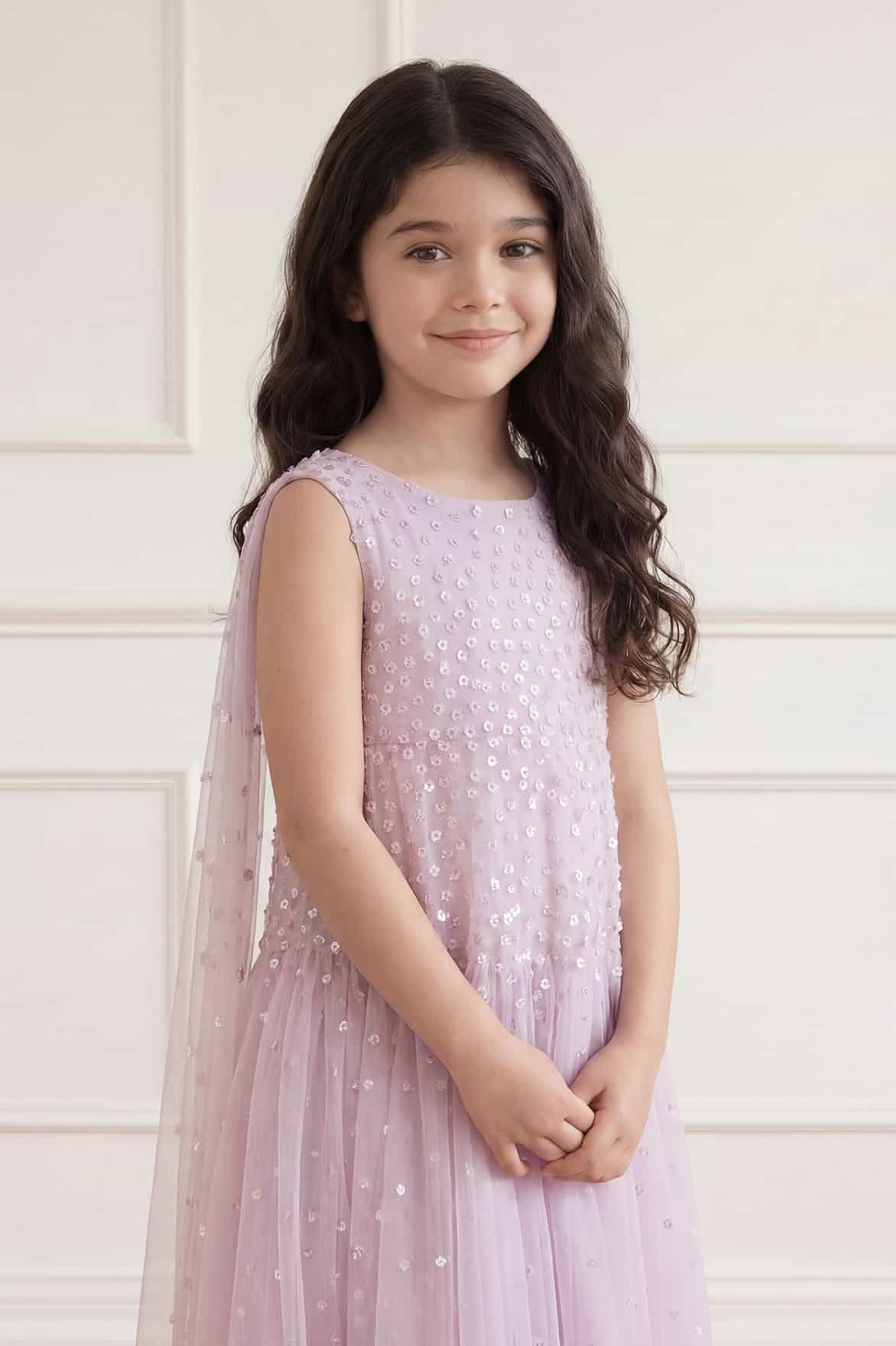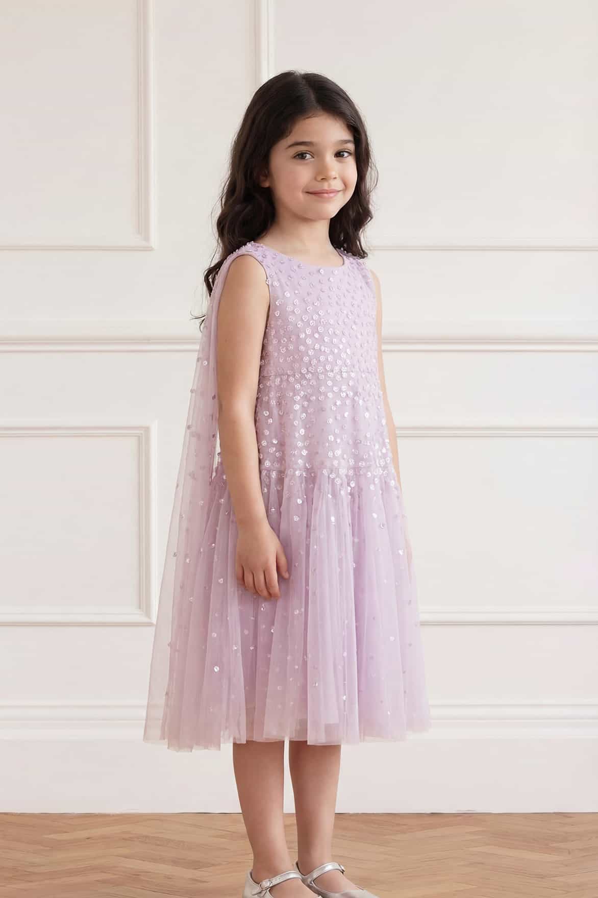NEW SEASON. The Sunrise Sequin Cape Kids Dress in Powder Lilac. This enchanting kids dress is adorned with softly shimmering sequin dots arranged in gentle linear bands for a luminous effect. Designed with a relaxed fit, flowing cape detail and full skirt, it creates graceful movement. Perfect for a party moment.