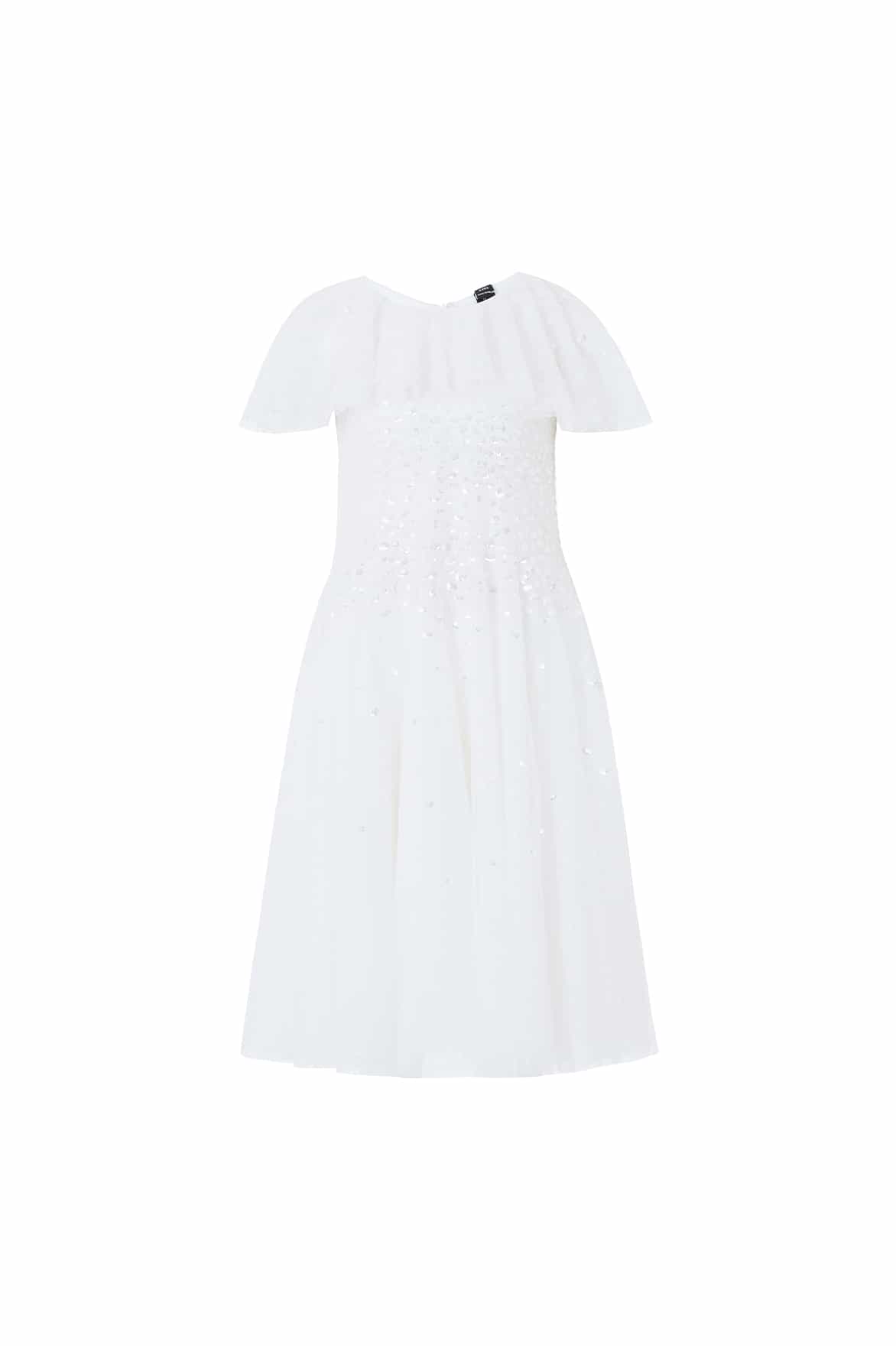 NEW SEASON. The Sunrise Sequin Short Cape Kids Gown in Swan White. This enchanting full-length kids gown features delicate sequin detailing that softly fades across the silhouette for a luminous effect. Designed with a graceful short cape and flowing skirt for elegant movement. A stunning flower girl style, thoughtfully aligned with the Sunrise Sequin V-Neck Ankle Gown.