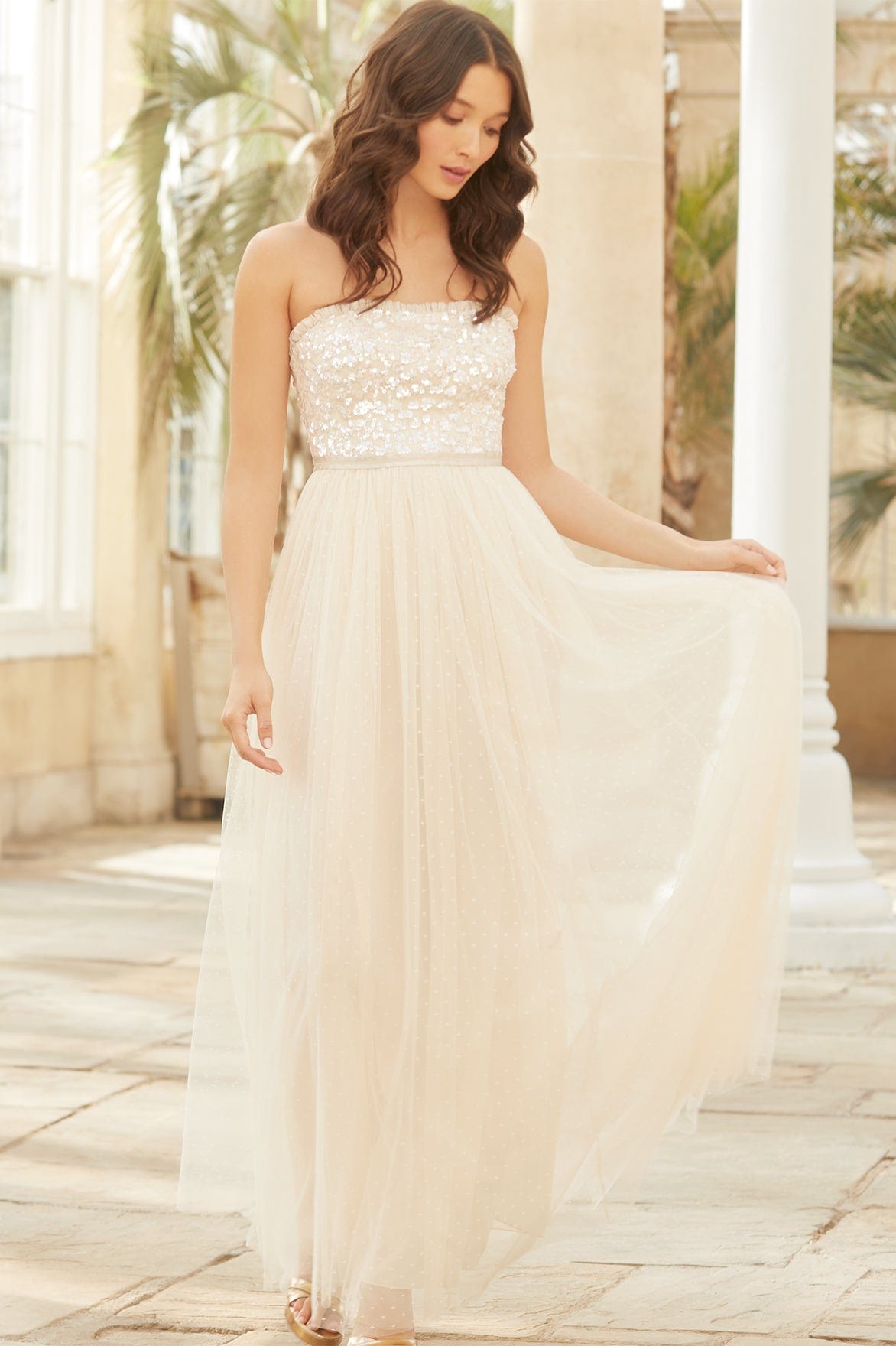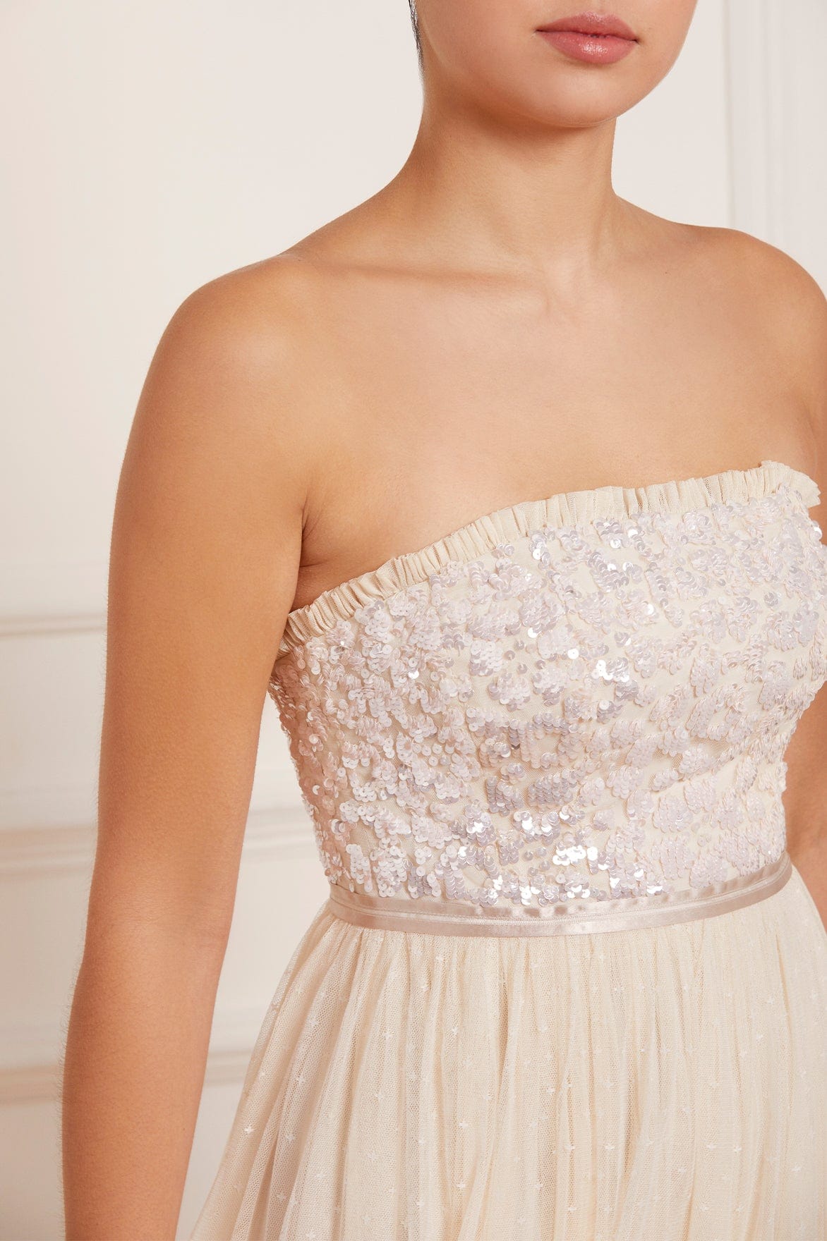 The Tempest Strapless Corset Bodice Gown in Champagne/Pink. The bodice of this gown is embellished with shimmering, iridescent sequins in romantic floral lace motifs. Designed with an integrated corset made with ribbon stitching, soft boning and panels of stretch mesh fabric for comfort and security in the fit. Crafted with layers of signature kisses tulle creating romantic movement as you walk. A true fairytale piece in the collection.