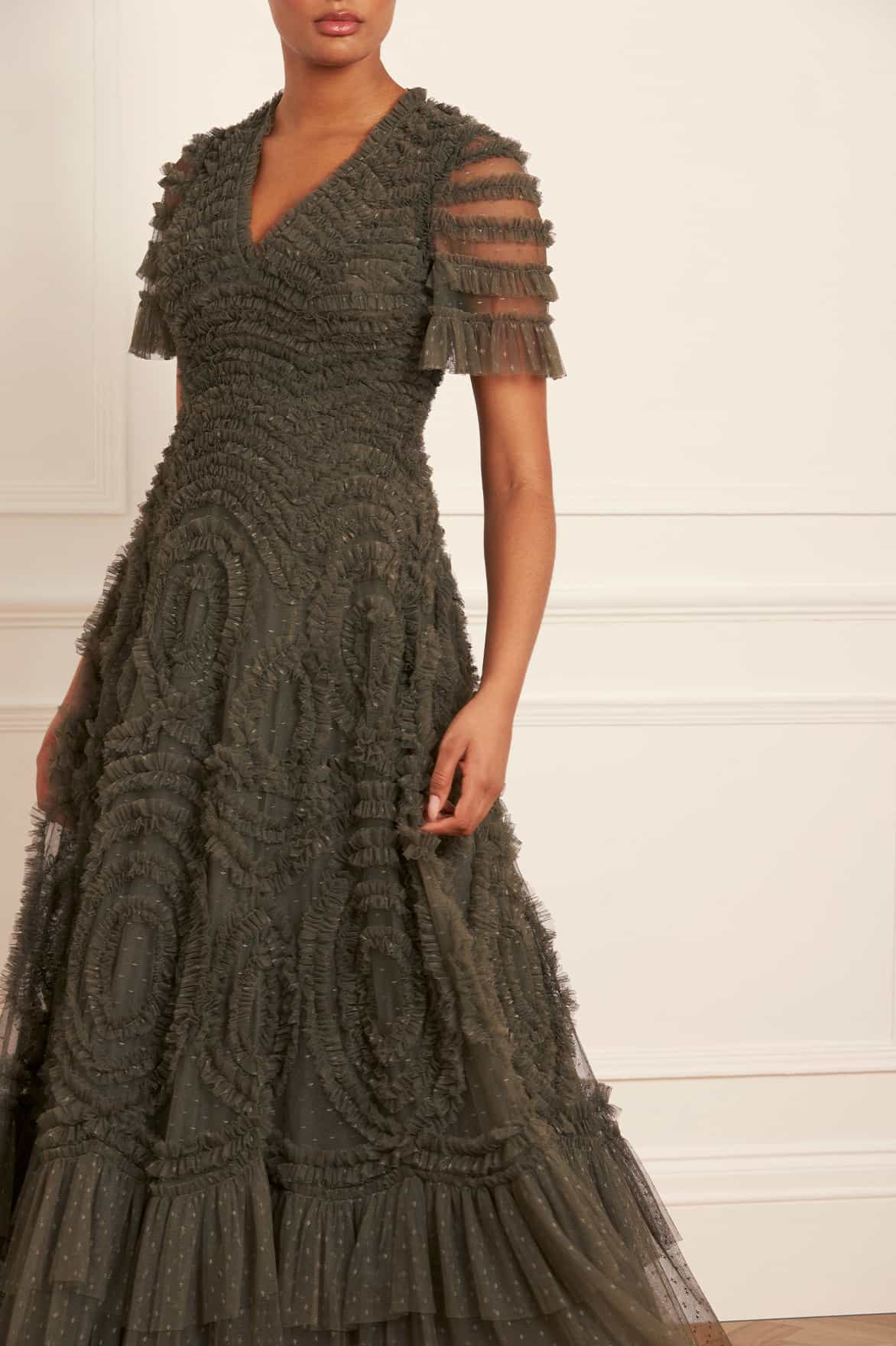 The Verity Ruffle V-Neck Gown in Juniper. A brand new colour for the season ahead. This textile piece is designed with signature Needle & Thread detailing. Beautifully developed with romantic, frothy tulle and delicate ruffles, creating a beautiful artistic effect and flattering shape. Make a statement in the Verity.