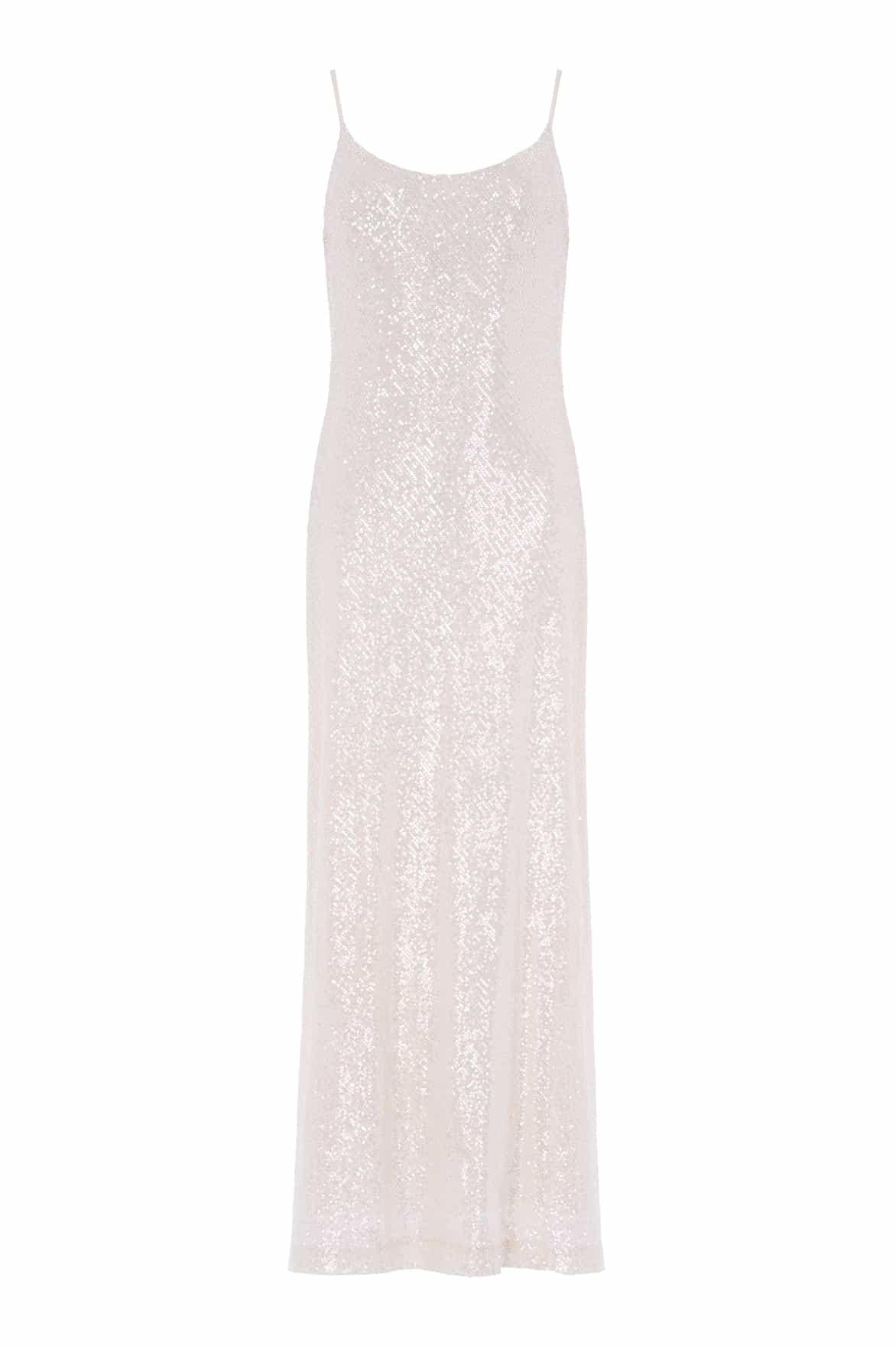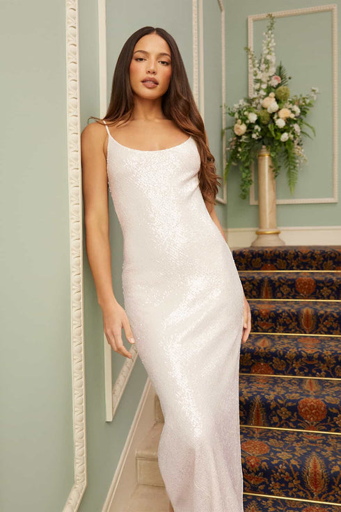 NEW SEASON. The Yvonne Sequin Cami Gown in Cream. Cut on the bias for an elegant, fluid fit. Crafted from stretch mesh adorned with high-shine sequins, this gown shimmers beautifully with every movement, creating a luxurious, show-stopping finish.
