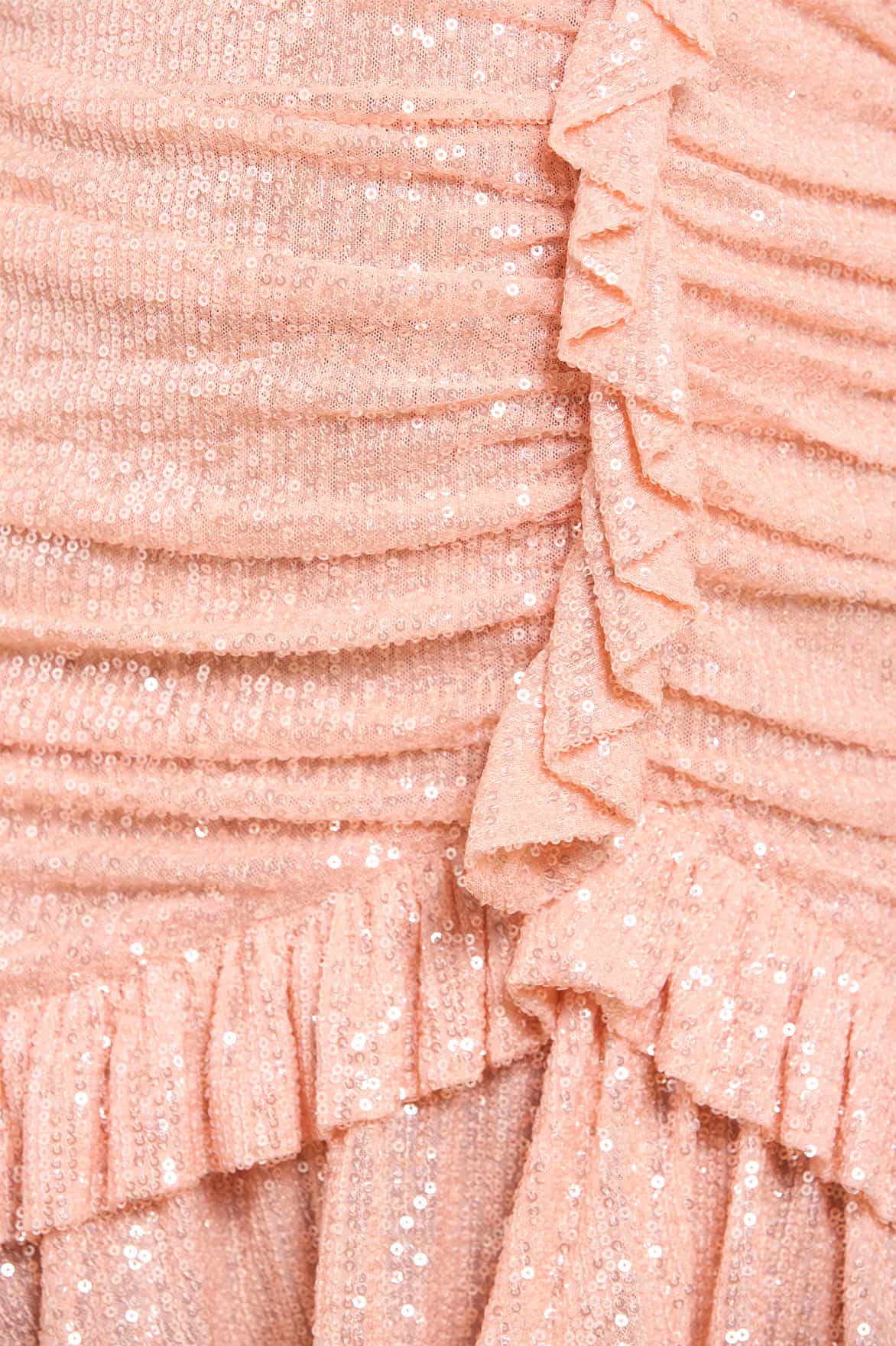 The Alessia One Shoulder Micro Mini Dress in Apricot. Designed with flattering gathered ruching, signature Needle & Thread frills, and a romantic one-shoulder design. Crafted with a blouson sleeve with a ruffle cuff adds elegance, while the dropped waist seam is enhanced with more ruffles. Developed from a delicate stretch mesh with tiny sequins, it offers a shimmering, luxurious finish. A timeless addition to your wardrobe, this dress combines effortless style and everyday luxury.