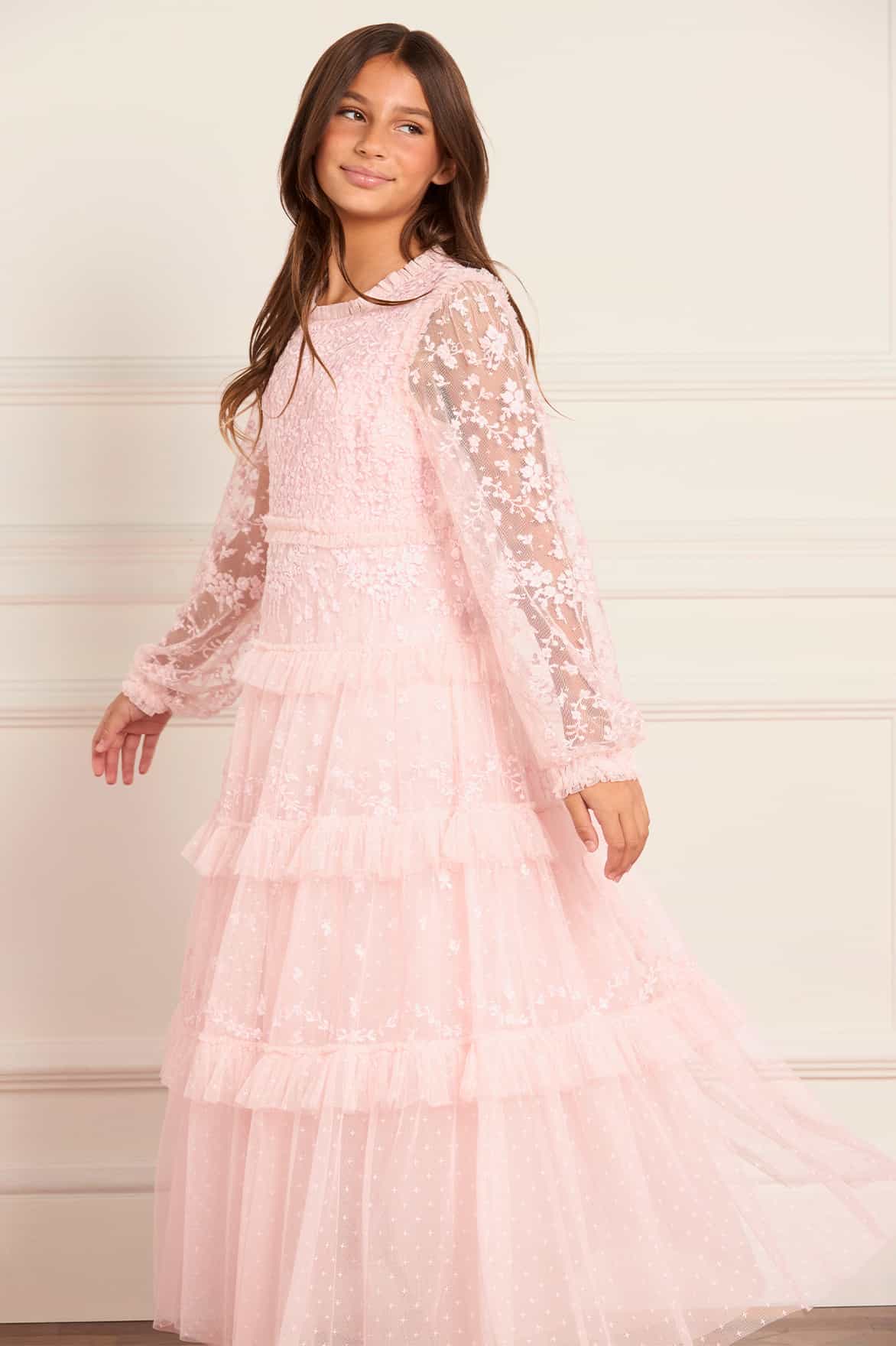NEW SEASON. The Blossom Lace Kids Gown in Seashell. A dreamy lace design with soft tulle layers. Featuring delicate floral lace and a gently flared skirt, this gown is perfect for twirling and little celebrations.