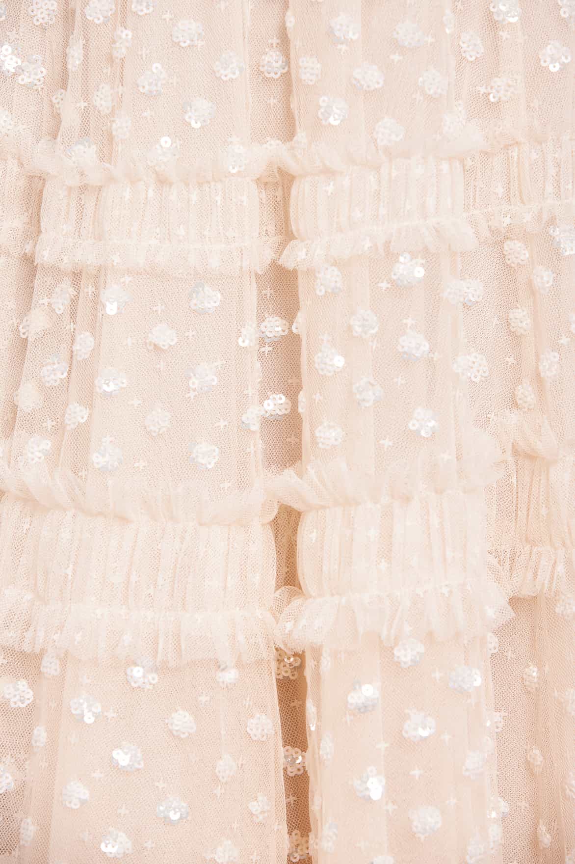 The Dot Shimmer Tiered Strapless Ankle Gown in Cream. This romantic dress features delicate sequins in a polka dot motif creating a shimmering effect throughout. The silhouette is adorned with double-stitched ruffles, giving it a frothy, romantic texture. The voluminous skirt is made from layers of tulle and net, creating a sweeping hemline with dramatic movement. Crafted from our signature textured kisses tulle and includes an integrated corset for the perfect shape and structure.