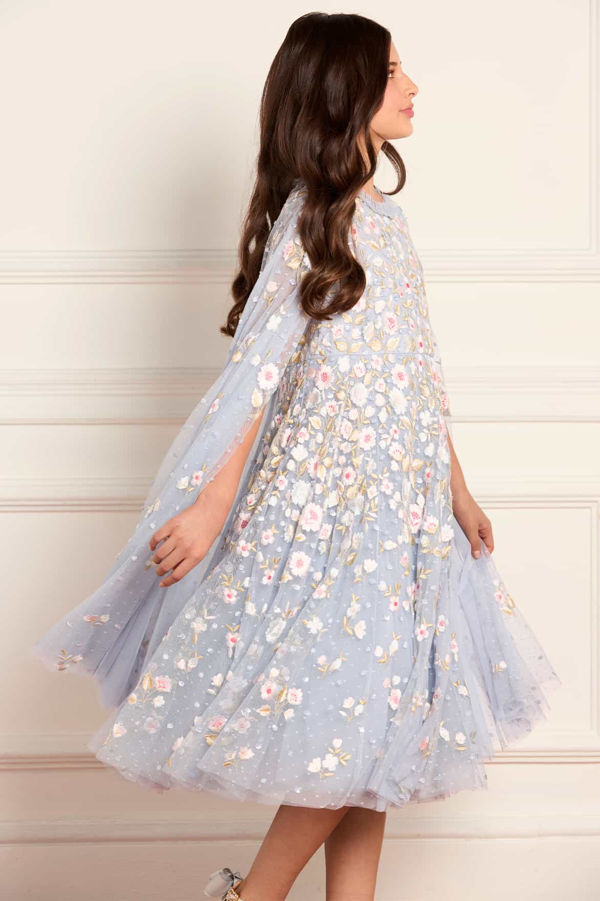 NEW SEASON. The Ethereal Blooms Cape Kids Dress in Skylight/Multi. Showcases delicate embroidery inspired by meadow blooms. With a fluttering cape and airy layers, this gown captures lightness and elegance. This style complements the Ethereal Blooms Frill Ankle Gown from the womenswear line for a soft, coordinated look.