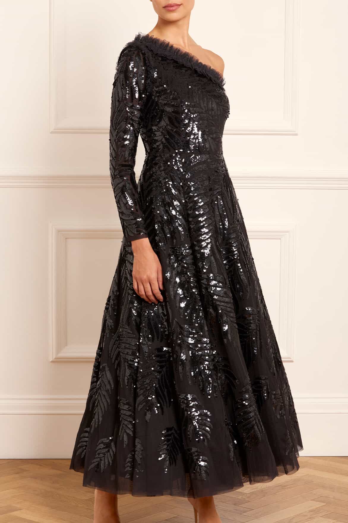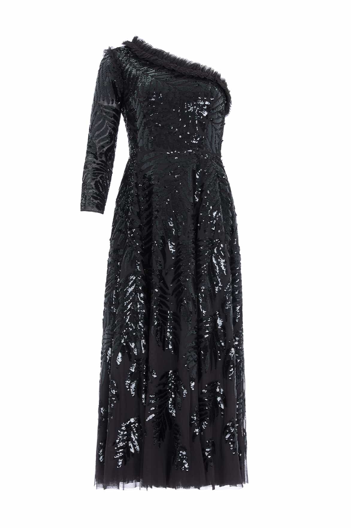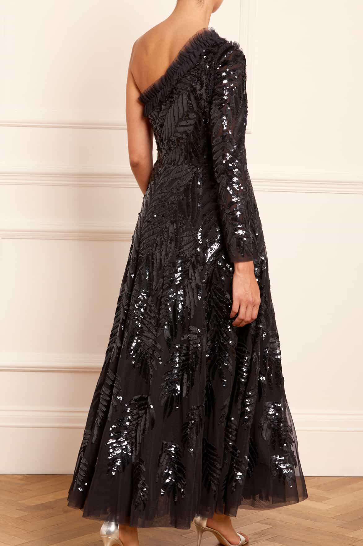 The Feather Sequin One-Shoulder Ankle Gown in Graphite. This show-stopping gown features statement feather sequin artwork inspired by costumes worn by the Follie’s dancers of the early 1900s. Beautifully designed with perfectly placed sequins gradually trailing towards the hem. Crafted with an elegant one-shoulder structure, slim sleeves and signature Needle & Thread tulle frills at the neckline and shoulder. The skirt is developed with generous layers of net and tulle for a sweeping hemline. The perfect gown for an upcoming special occasion and beyond.
