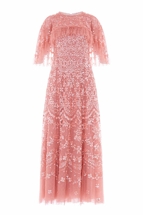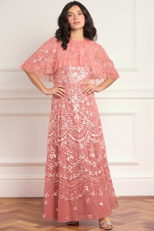 NEW SEASON. The Freya Cape Ankle Gown in Misty Rose. Exquisite Freya embellishment inspired by antique lacework adorns this romantic cape gown. Tiny high-gloss sequins and intricate scalloped borders create a flattering silhouette that softly fades towards the hem. The flowing ankle-length shape offers graceful movement for luxury evening wear.