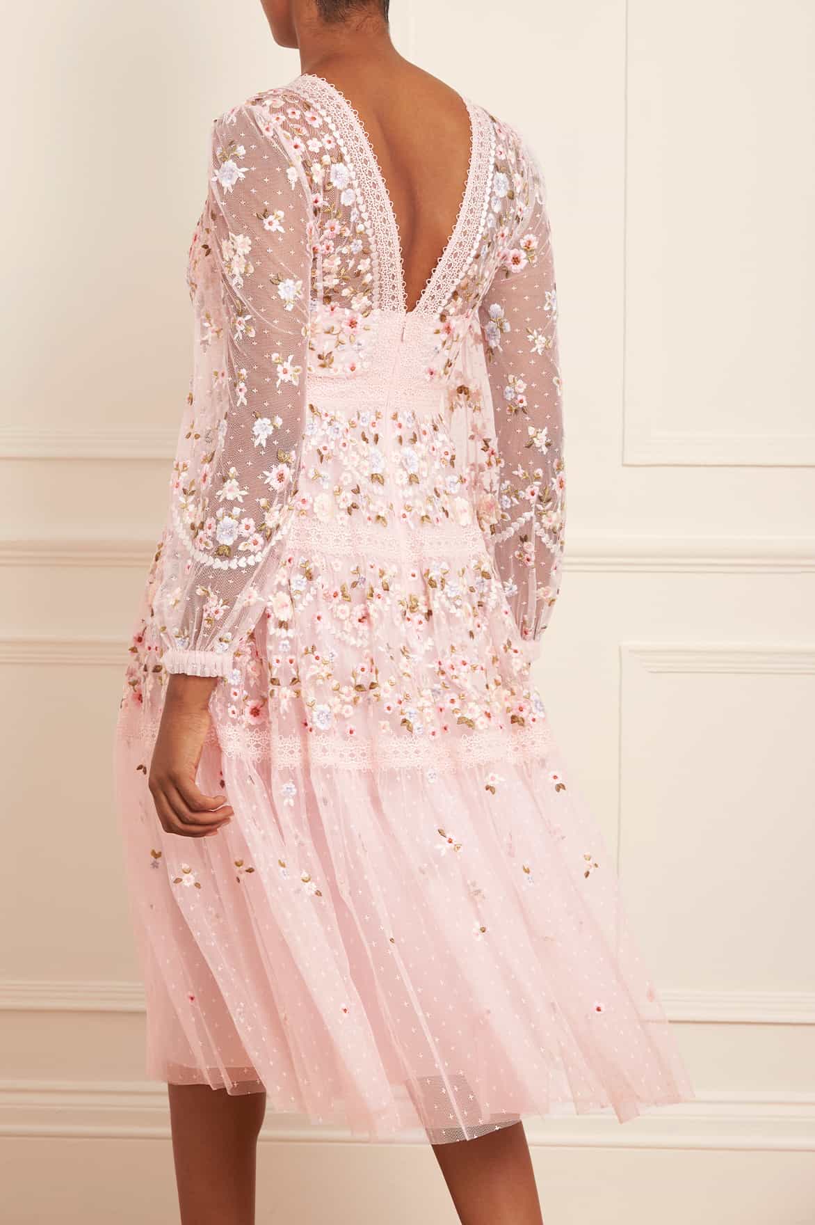 The Garland Ribbon Midaxi Dress in Peony Pink. This embroidered dress is inspired by Victorian lace trims. Beautifully designed with floral embroideries in soft pastel tones. Developed with a V-shaped waist seam to create a flattering, effortless fit. This dress is adorned with intricate lace trims for signature Needle & Thread detailing. A pretty piece you'll forever treasure.