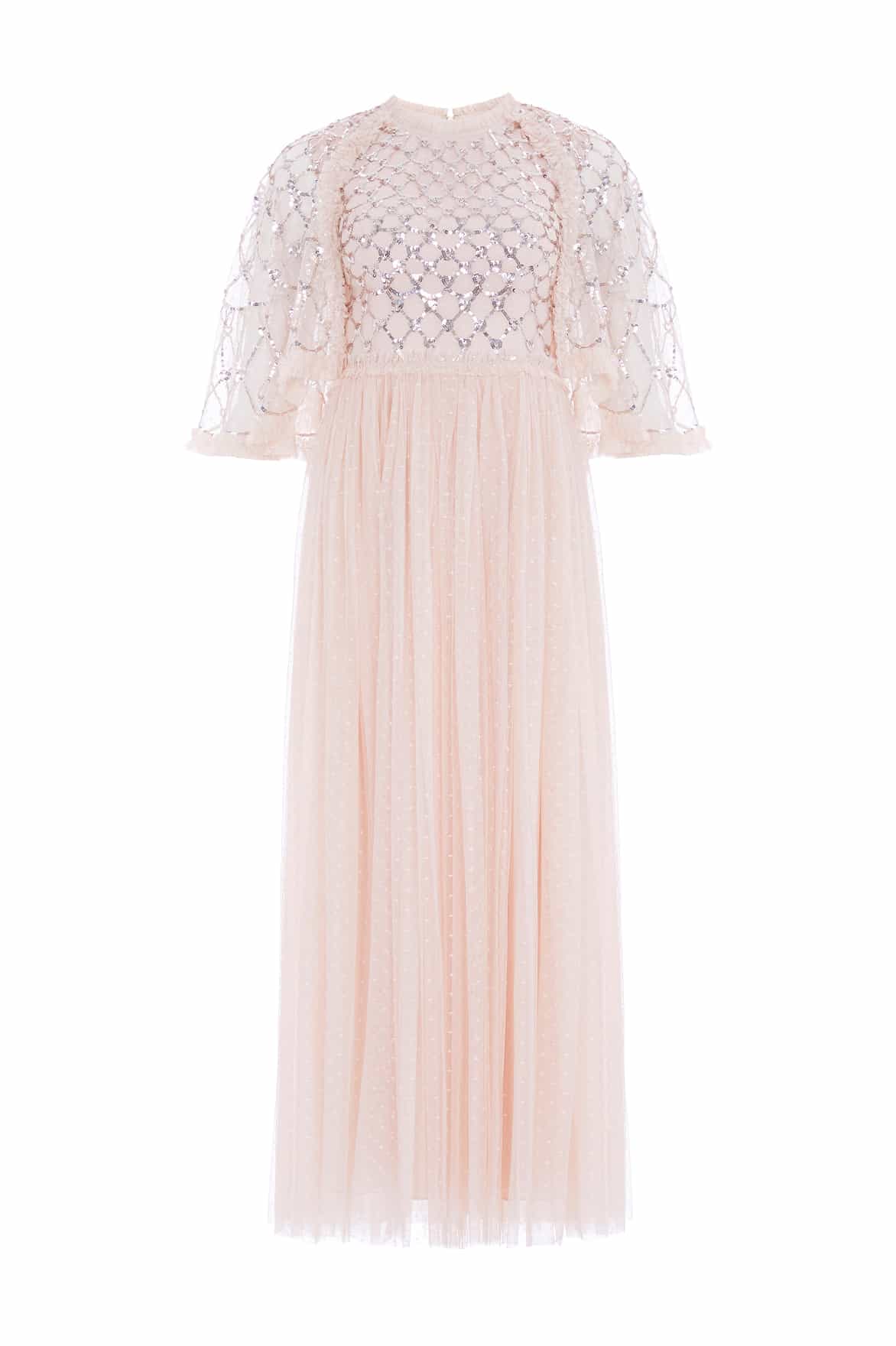 The Heart Lattice Bodice Cape Ankle Gown in Dust Beige/Silver. The bodice of the gown is decorated with intricate embellishments made using the smallest sequins for exquisite detailing. Beautifully designed with heart-shaped motifs in a lattice layout. Developed with signature Needle & Thread soft tulle trims and a layered skirt for romantic detailing and a statement look. The perfect gown for a bridesmaid moment or an upcoming special occasion.