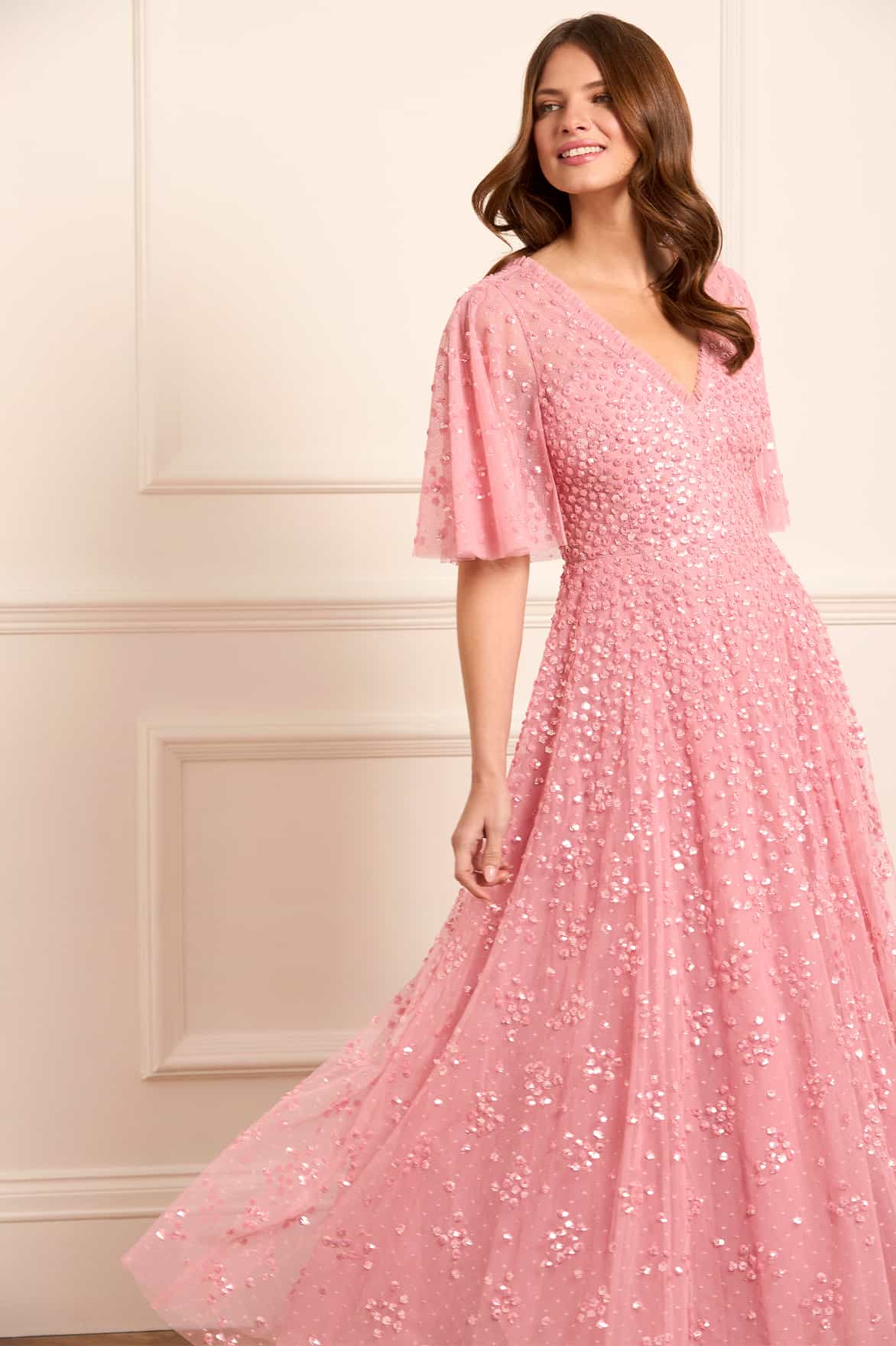 The Leila Dot V-Neck Cape Ankle Gown in Primrose is embellished with shimmering clustered dot motifs for a sparkling effect. This elegant V-neck gown features slim sleeves and signature Needle & Thread tulle frills at the neckline and armholes. The skirt, crafted from layers of net and tulle, finishes with a sweeping hemline. A captivating design.