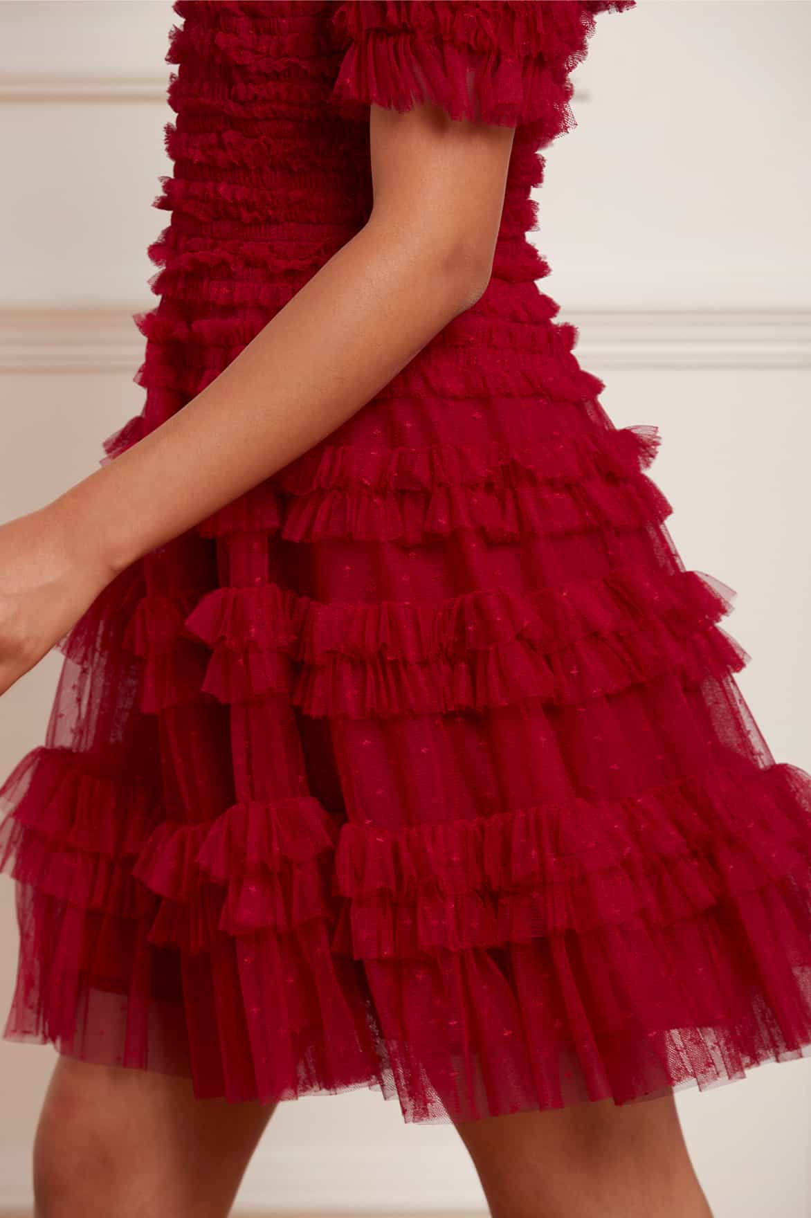 The Lisette Ruffle Off-Shoulder Micro Mini Dress in Deep Red. This statement dress has an elegant off -the-shoulder design inspired by Hollywood styling. Crafted with textile tulle and double-stitched frills for a dramatic, romantic effect. Designed with an integrated corset for a perfect fit and to hold the silhouette. Expect all eyes on you in this romantic dress.
