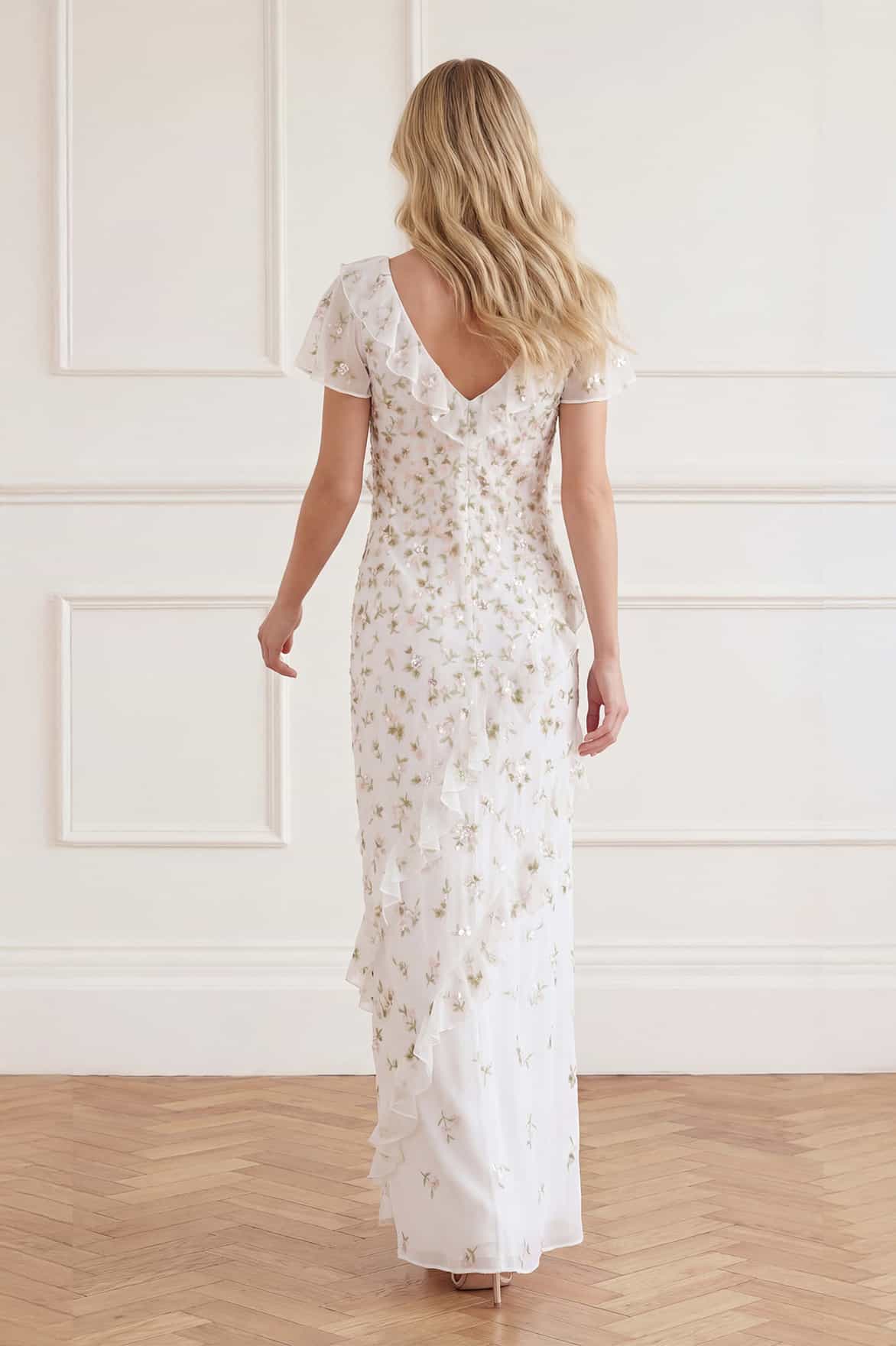 NEW SEASON. The Meadow Ditsy Georgette Gown in Swan White/Peach. This elegant georgette gown features romantic Meadow Ditsy embroidery inspired by the last blooms of summer. Cut on the bias for a smooth, body-skimming fit and effortless wear, the silhouette flows beautifully from bodice to hem.