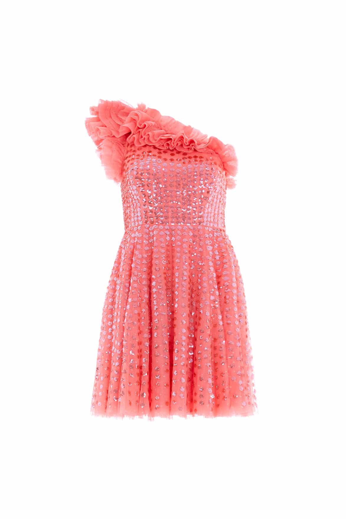 The Raindrop One Shoulder Micro Mini Dress in Pink Sky. This mini dress is beautifully adorned with enchanting sequin artwork. The artwork is designed with delicate shimmering polka dot sequins in a linear formation capturing the essence of glistening raindrops. Designed with an off-the-shoulder style for elegant detailing. The skirt is made from layers of frothy tulle featuring statement frill details, creating a signature romantic look. The dress is perfect for an upcoming special event.