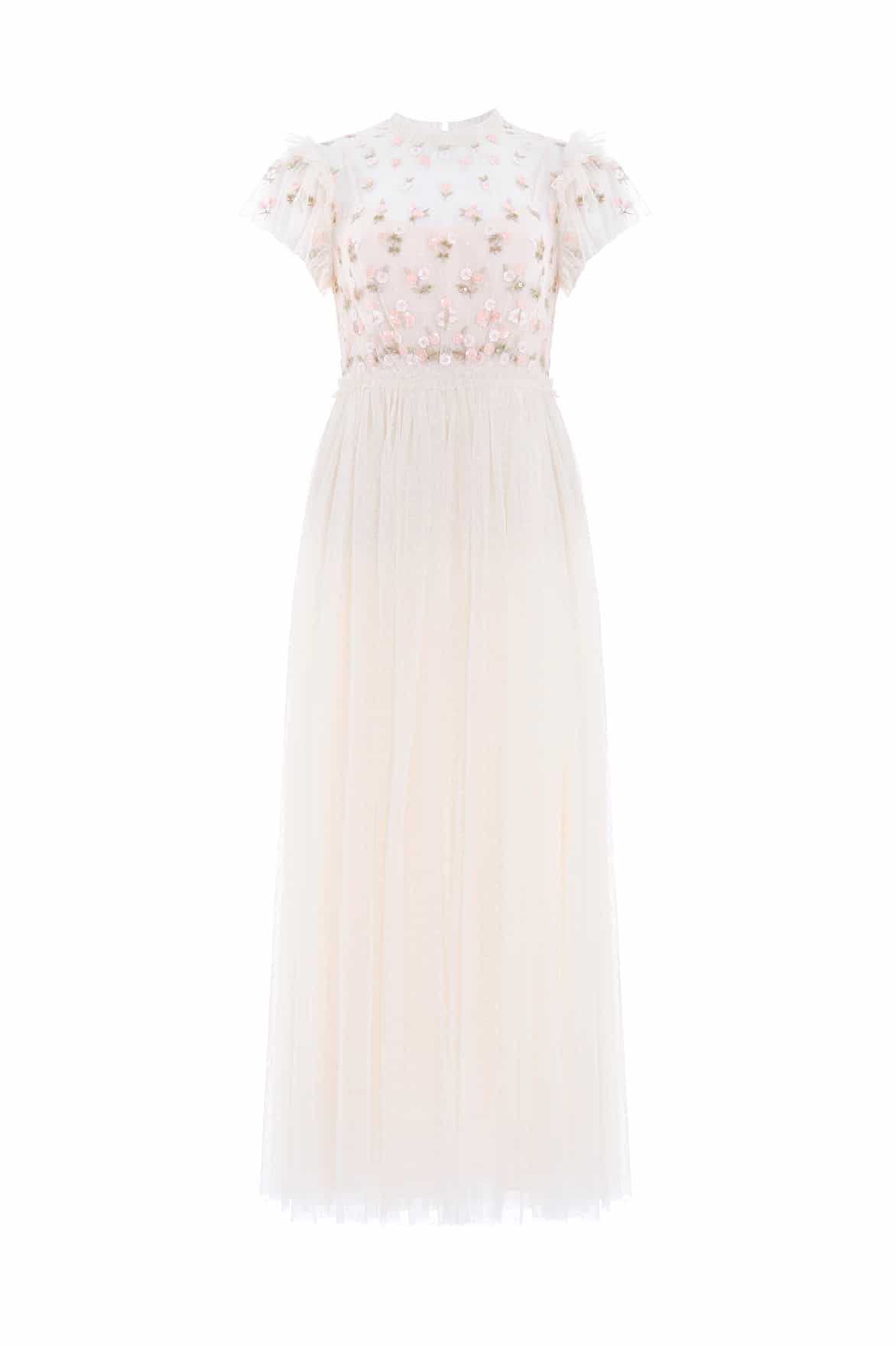 The Rococo Bodice Ankle Gown in Cream. A Needle & Thread signature archive style. The bodice of this gown is embellished with intricate floral motifs, highlighted with shimmering sequins. Inspired by flamboyant Rococo fashion with sheer sleeves adding romantic texture. The skirt is developed with layers of signature Needle & Thread soft tulle for a statement look. Dance the night away with the perfect level of shine.