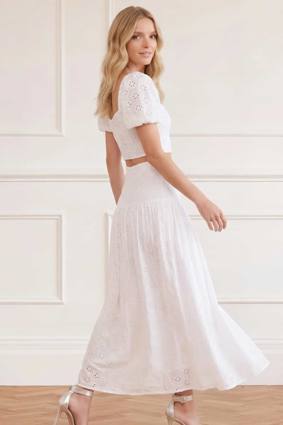 NEW SEASON. The Romilly Cotton Broderie Top in Optic White. Crafted from delicate cotton broderie featuring trailing daisy embroidery, this romantic top balances softness with subtle structure. Designed to sit elegantly on the body, it offers effortless femininity. The perfect pairing with our Romilly cotton broderie skirt.
