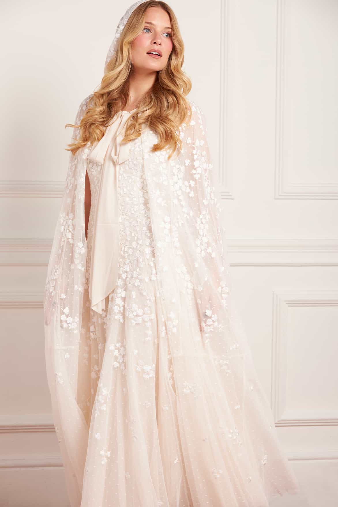 NEW SEASON | NEEDLE & THREAD EXCLUSIVE. The Scatter Blossom Hooded Long Cape in Cream. An enchanting piece adorned with delicate ditsy embroidery. Designed with a softly draped hood and floor-length silhouette, this exclusive cape adds ethereal charm to any occasion look.