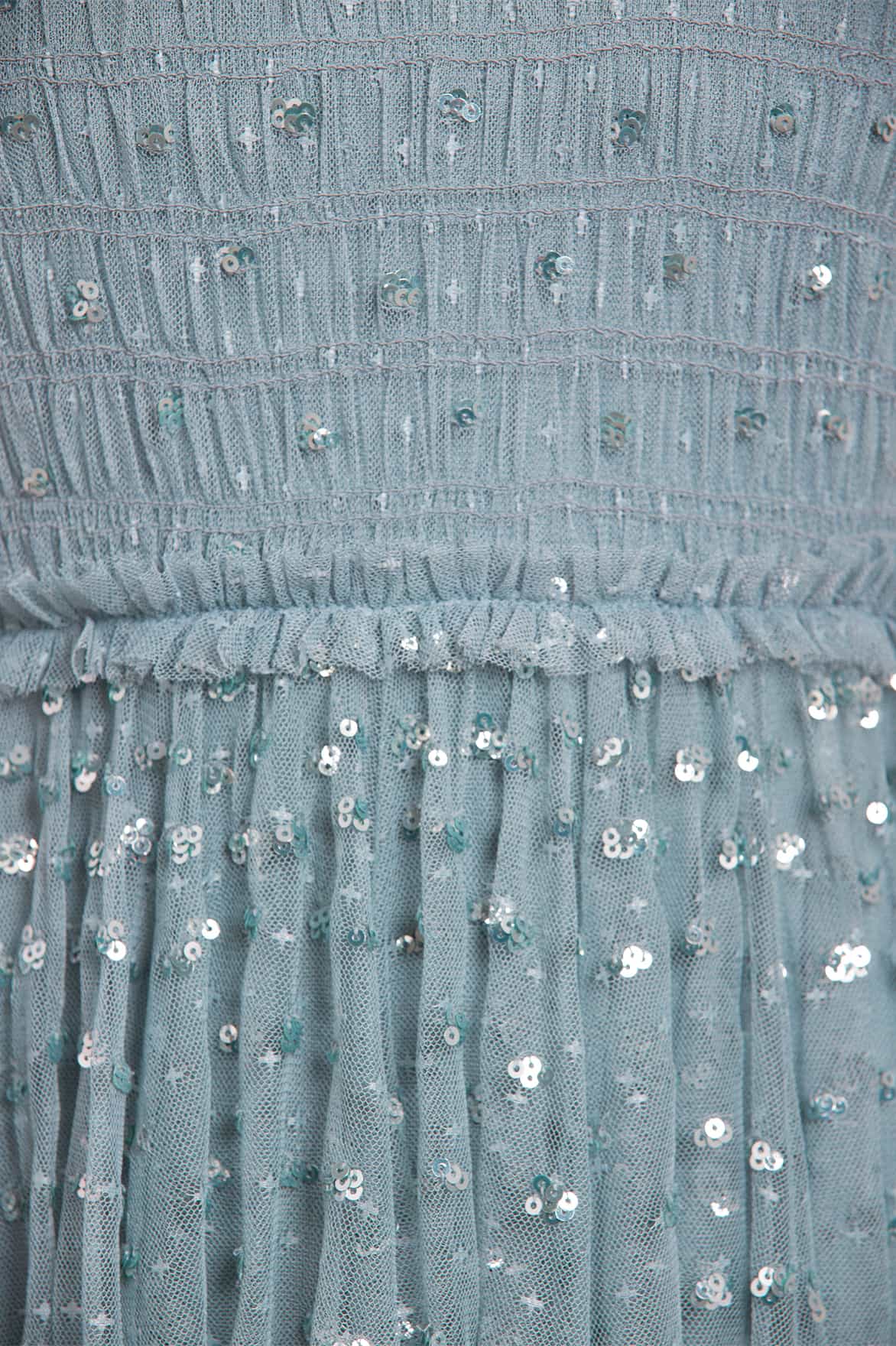 The Sequin Giselle Smocked Ballerina Dress in Thistle Blue. This enchanting dress is embellished with shimmering sequin dot motifs that gently scatter towards the hem, catching the light with every movement. Each sequin features a special high-shine, gloss finish, achieved through an exclusive foil coating for an extra-lustrous effect. The shirred bodice offers a flattering, flexible fit, complemented by short puff sleeves finished with delicate tulle frill cuffs. Signature Needle & Thread ruffles adorn the neckline, shoulders, and waist, adding romantic texture and dimension throughout.