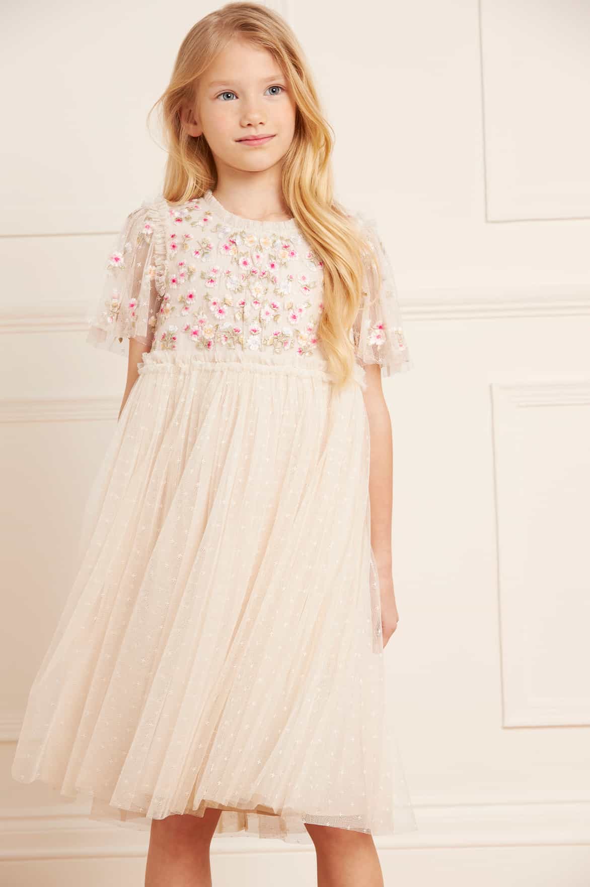 NEW SEASON. The Wildflower Ditsy Bodice KIDS Dress In Cream/Azalea Pink. The bodice of the dress is embroidered with floral motifs in soft, pastel shades inspired by floral garden paintings. Developed with a soft tulle skirt creating playful movement as she walks. Let your little one twirl around in the Wildflower at her next event.