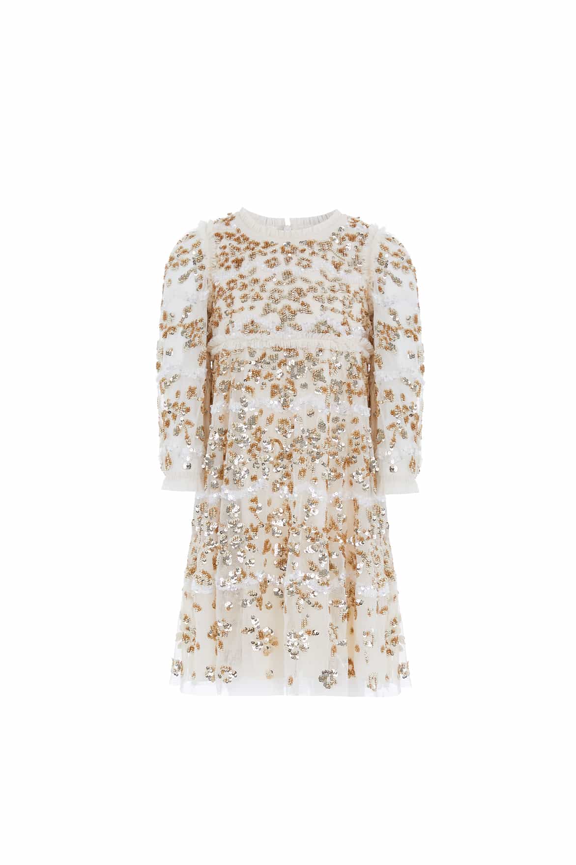 The Alicia Sequin KIDS Dress in Champagne / Gold. This KIDS style features signature Needle & Thread details. Beautifully designed with high-impact, lustrous sequins creating an all-over shimmering effect. This KIDS dress has intricate artwork featuring floral and scallop shape motifs cascading down the dress. Let your little one shine at her next event.