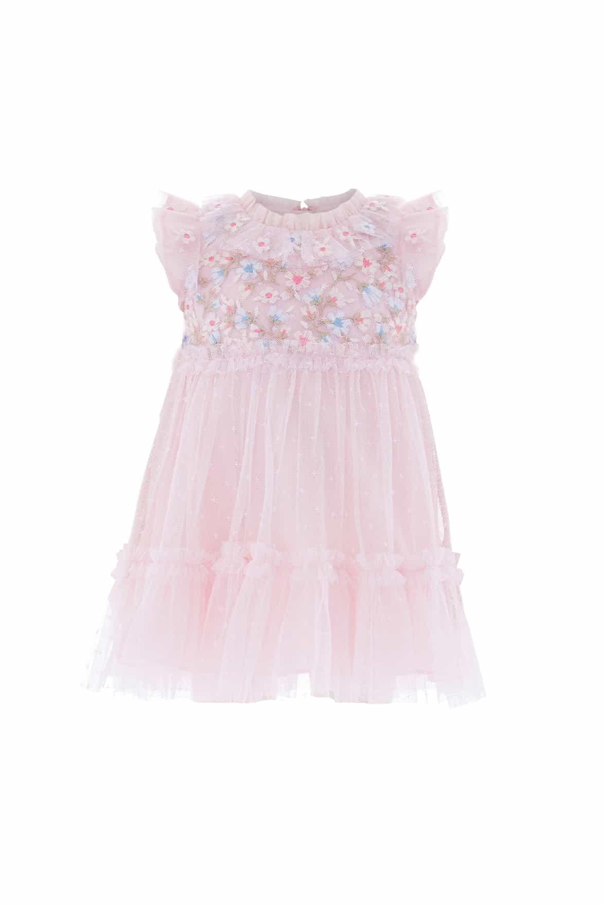 The Antoinettes Floral Bodice Baby Dress in Peony Pink. A dreamy piece inspired by the romance of Versailles. Crafted with delicate multicoloured floral embroidery scattered across a cloud of tulle, signature frills at the neckline and waist add a touch of enchantment. Designed with layered tulle sleeves and a gently ruffled skirt, it creates a floaty, ethereal silhouette. Finished with a breathable cotton voile lining and frilled bloomers for comfort. This dress is perfect for every magical moment.