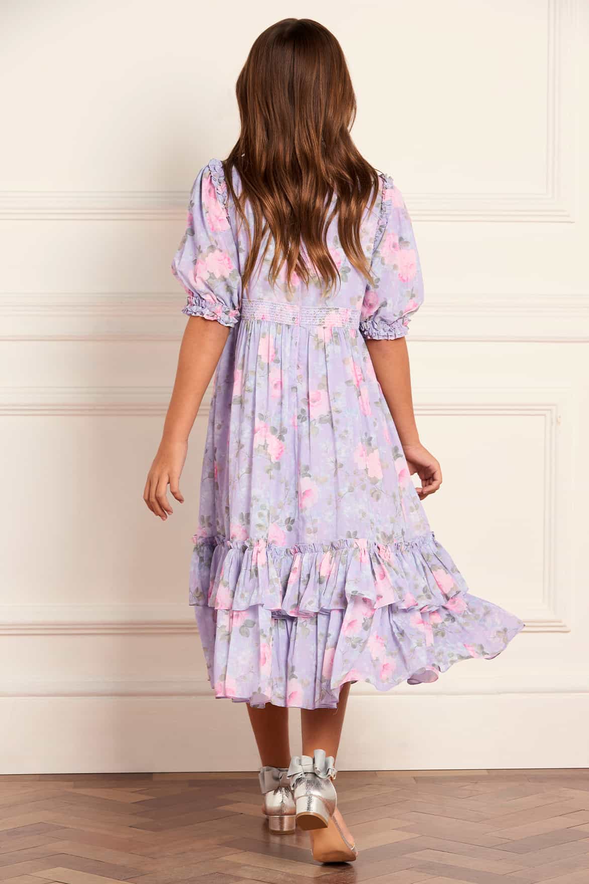 NEW SEASON. The Camille’s Garden Chiffon Smocked Kids Dress in Lavender Crafted from airy chiffon printed with soft floral motifs. Designed with a smocked bodice and gentle ruffles, this style pairs perfectly with the Camille’s Garden Round Neck Ballerina Dress from the womenswear line for a beautifully coordinated ensemble.