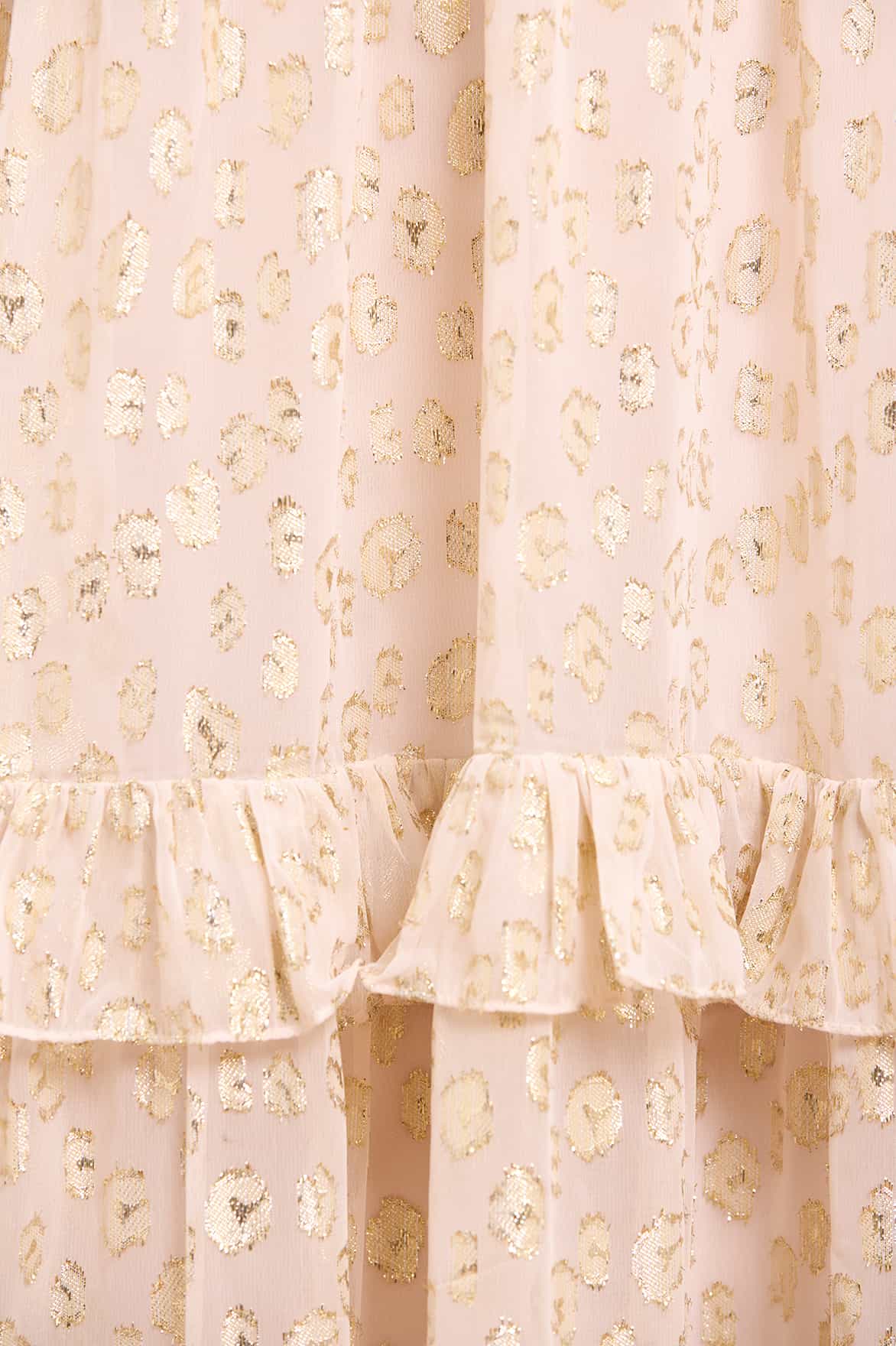 The Cherie Lurex Ankle Gown in Opal. A subtly sparkling style, crafted from fluid georgette with metallic lurex thread. With a softly gathered silhouette and romantic long sleeves, this gown glimmers gently as it catches the light. An elegant option for unforgettable moments.