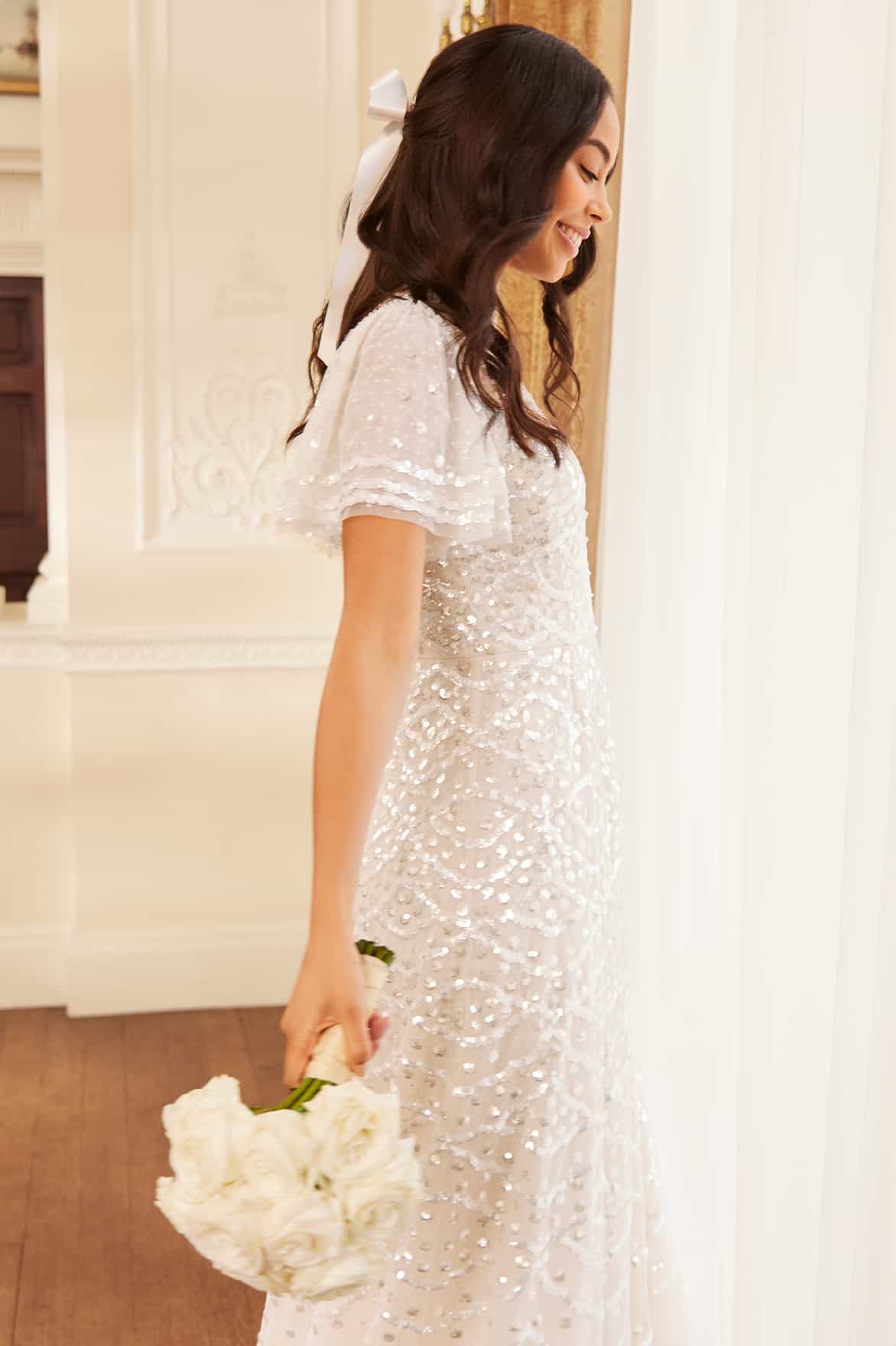 The Deco Dot Gloss Ankle Gown in Cream. This style has an artwork inspired by 1930’s art deco styling. Developed with layered tulle sleeves and a sequin border edge for 1930’s romantic styling. The perfect gown for an upcoming special occasion.