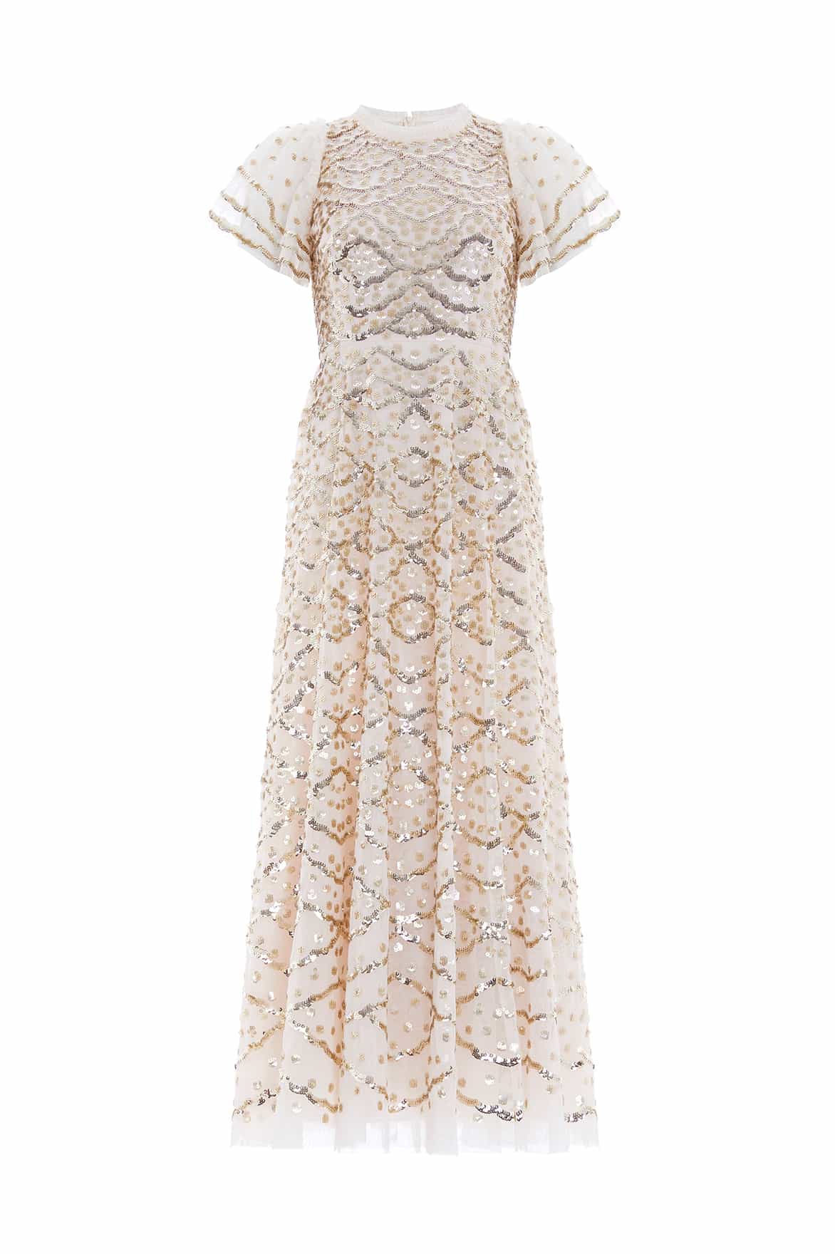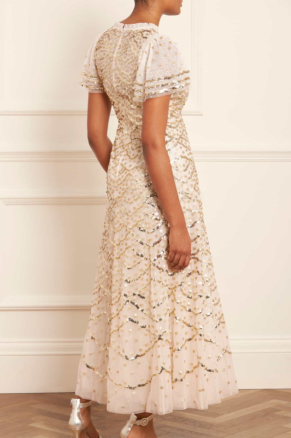The Deco Dot Gloss Ankle Gown in Cream / Gold. Created with beautiful artwork inspired by 1930’s art deco styling. This gown features exquisite, high-shine sequins featuring an extra foil coat finish for an ultra-shimmering effect. Developed with layered tulle sleeves with a sequin border edge for a romantic look. Expect all eyes on you in this statement piece.