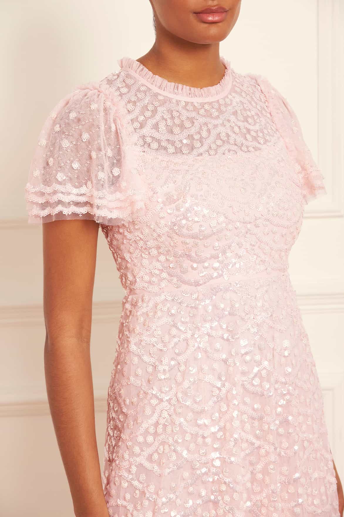 The Deco Dot Gloss Ankle Gown in Peony Pink. This style has an artwork inspired by 1930’s art deco styling. Developed with layered tulle sleeves and a sequin border edge for 1930’s romantic styling. The perfect gown for an upcoming special occasion.