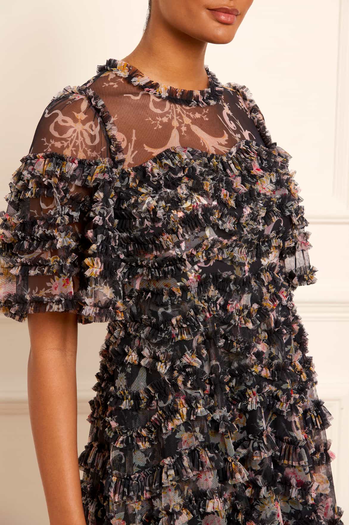The Enchanted Garden Bronte Ballerina Dress in Graphite. This dress is printed with a signature Needle & Thread print, taking inspiration from an archival hand-painted wallpaper design, bringing to life romantic garden florals and historical motifs. The textile was meticulously developed by the designer in 3D directly onto the mannequin, resulting in perfectly proportioned, romantically frothy frills arranged in intricate scallop and oval designs. Designed with a sheer yoke adding an extra touch of romance, while the softly gathered hem is adorned with layers of frills, enhancing the gown’s ethereal beauty. This gown boasts a flattering silhouette, with a bodice that hugs the figure and a skirt made up of generous layers of net and tulle, creating a sweeping hemline that exudes grace and sophistication. Perfect for any special occasion, the Enchanted Garden is a breathtaking blend of history and couture craftsmanship, designed to make a lasting impression.