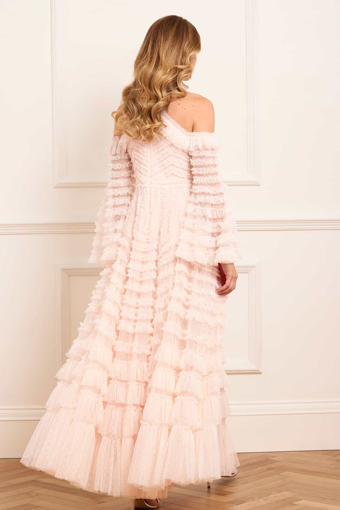 The La Vie En Rose Off-Shoulder Gown in Opal/Cream. Soft tulle ruffles and frothy gathered frills complement the figure with a flattering neckline and contouring silhouette, the graduated frill detailing adds texture and movement. A romantic option for unforgettable moments.