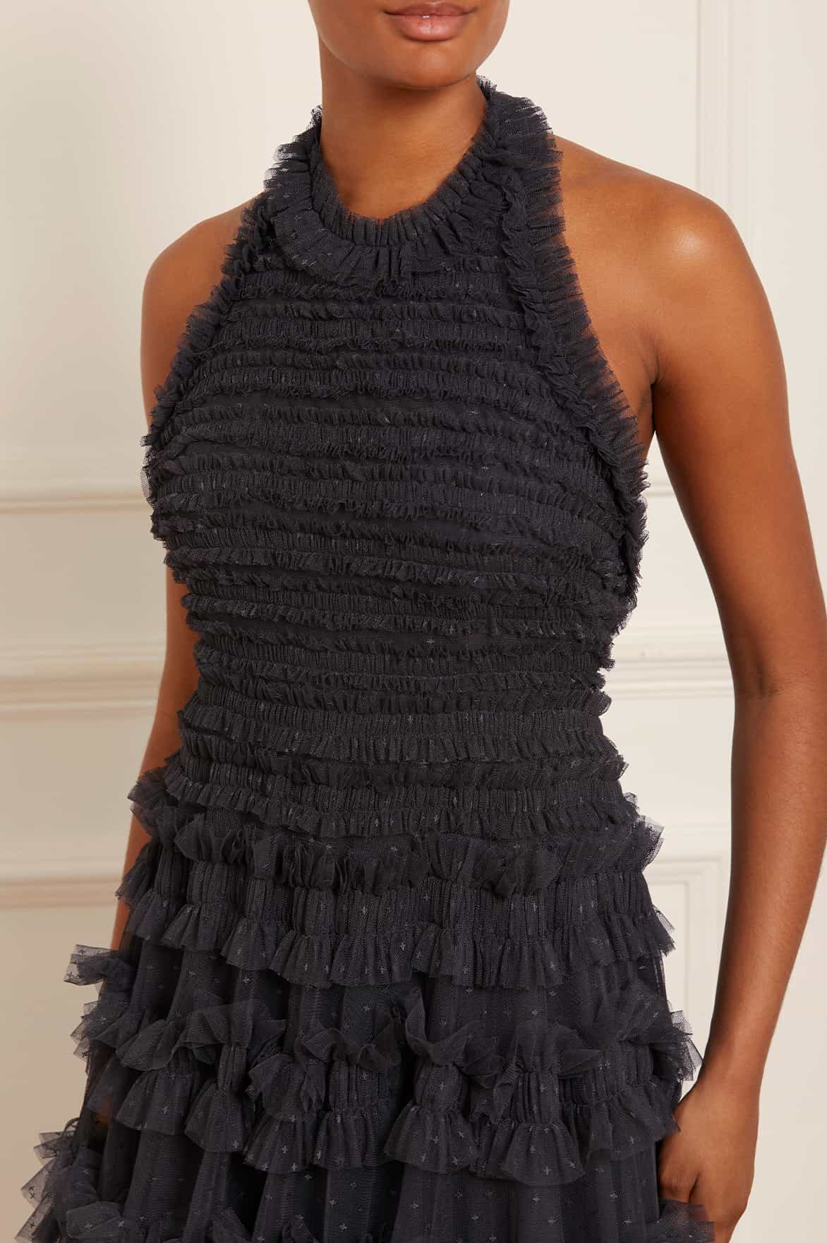 The Lisette Ruffle Halter Neck Micro Mini Dress in Graphite. A brand new shape for the season ahead. Crafted with an elegant halter neck and backless design. Beautifully engineered with signature Needle & Thread textile, delicate tulle panels and perfectly placed frills. Designed with a generous sweeping hemline made from layers of tulle and net to create a romantic silhouette. Make an entrance in this show-stopping dress.