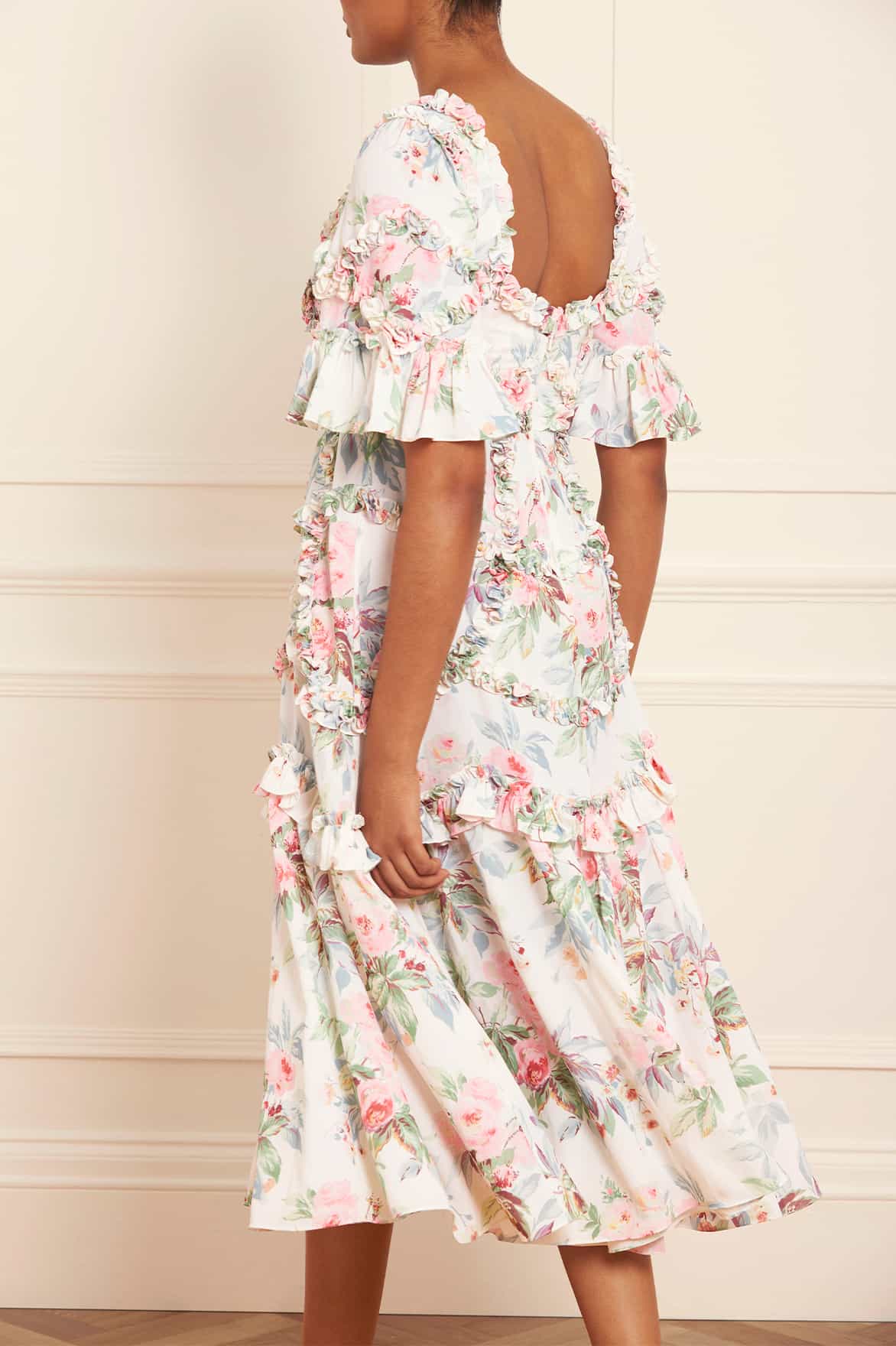 The Paradise Garden Alice Crepe Ballerina Dress in Moonshine. The print of this dress is inspired by an enchanting paradise garden print, taken from an 1900s hand-painted artwork. This dress is designed with a luxe, twilight inspired colour palette in rich, lush floral motifs to create a truly alluring print. Developed in our soft, fluid crepe fabric with gently gathered frills to create a signature effortless Needle & Thread style. The perfect dress for your summer wardrobe.