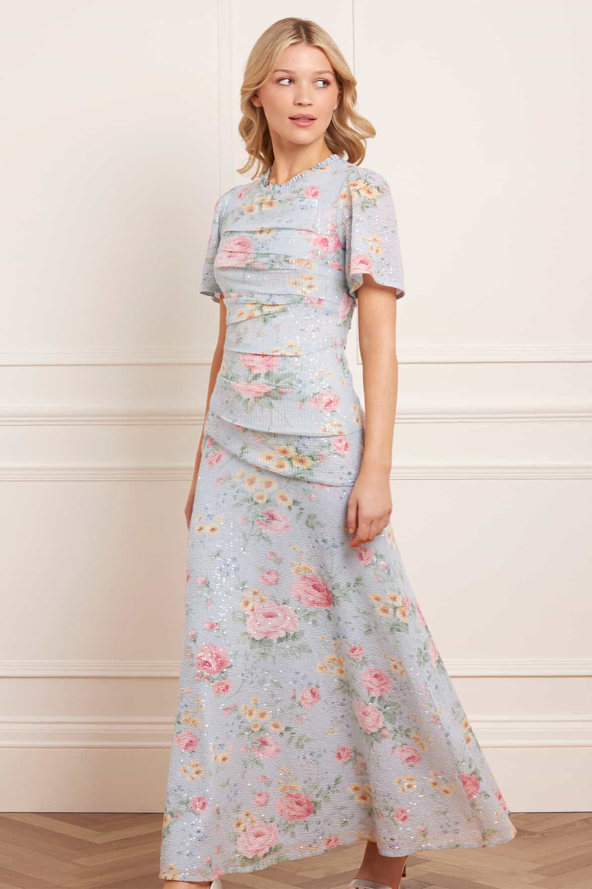 The Pompadour Garden Sequin Gown in French Blue. Inspired by the opulent wall coverings of the Palace of Versailles, this gown features luxurious hand-painted floral bouquets and trailing ditsy motifs. Crafted with tiny clear sequins delicately applied for a transparent, shimmering effect. The slim silhouette is beautifully draped, flattering the body, while the fluid, sweeping skirt adds movement. Short sleeves complete the refined, elegant look, making this gown a true statement of luxury and craftsmanship.