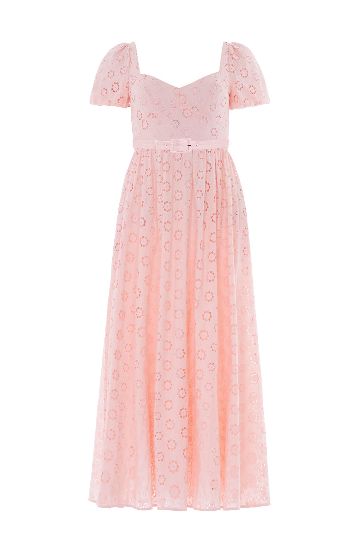 NEW SEASON | NEEDLE & THREAD EXCLUSIVE. The Romilly Cotton Broderie Ankle Gown in Pale Pink/White. Adorned with intricate daisy broderie detailing, this romantic gown evokes the charm of late summer florals. The softly sculpted bodice falls into an ankle-length skirt with effortless movement.