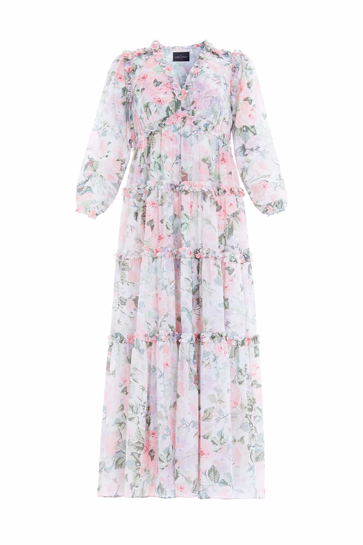 The Rose Powder Chiffon Ankle Gown in Moonshine. This gown is inspired by a 1900s hand-painted wallpaper design. Beautifully printed with florals in faded pastels for a vintage look. Developed with a soft chiffon fabric with a loose fitting silhouette for effortless styling. Designed with an upwards V-shaped waistline to create a flattering fit, gathered ruffles and skirt tiers for a signature Needle & Thread look. A versatile piece you'll forever cherish.